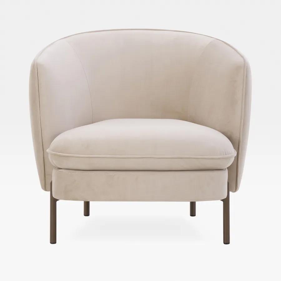 LO exudes elegance with its soft beige recycled polyester fabric and sleek metal legs. The curved backrest and plush cushion provide comfort, making it a sophisticated, eco-friendly choice that adds modern charm to your living room or bedroom.