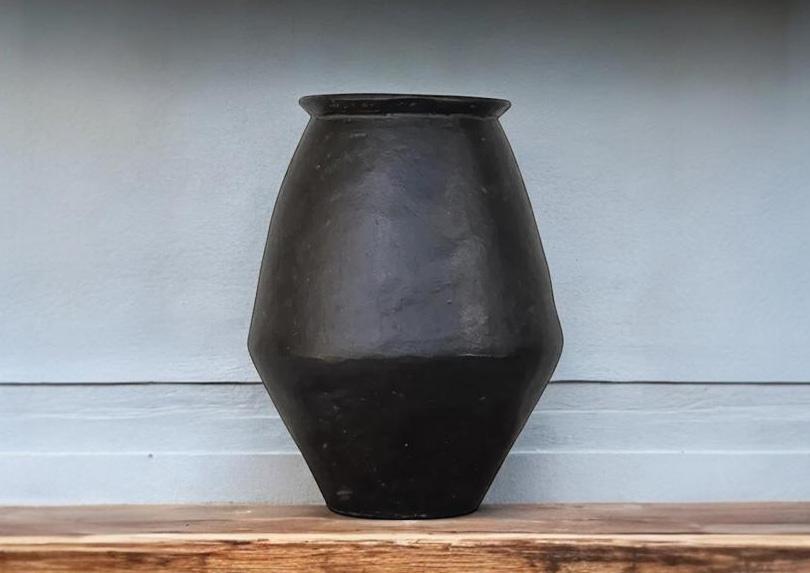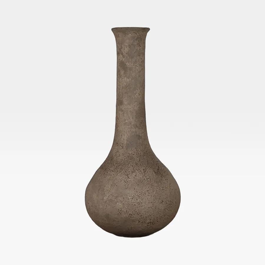 is a sculptural clay vase with a tall neck, rounded body, and textured surface. Its natural earthy finish and graceful form celebrate traditional pottery, making it a refined statement piece for any setting. DESCRIPTION