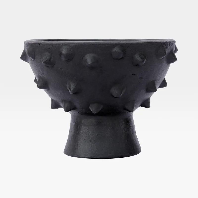 NAHA bowl features a bold studded texture and a deep black finish. Its sculptural form adds a striking, contemporary edge, making it a statement piece for displaying decor or standing alone as artistic decor. DESCRIPTION