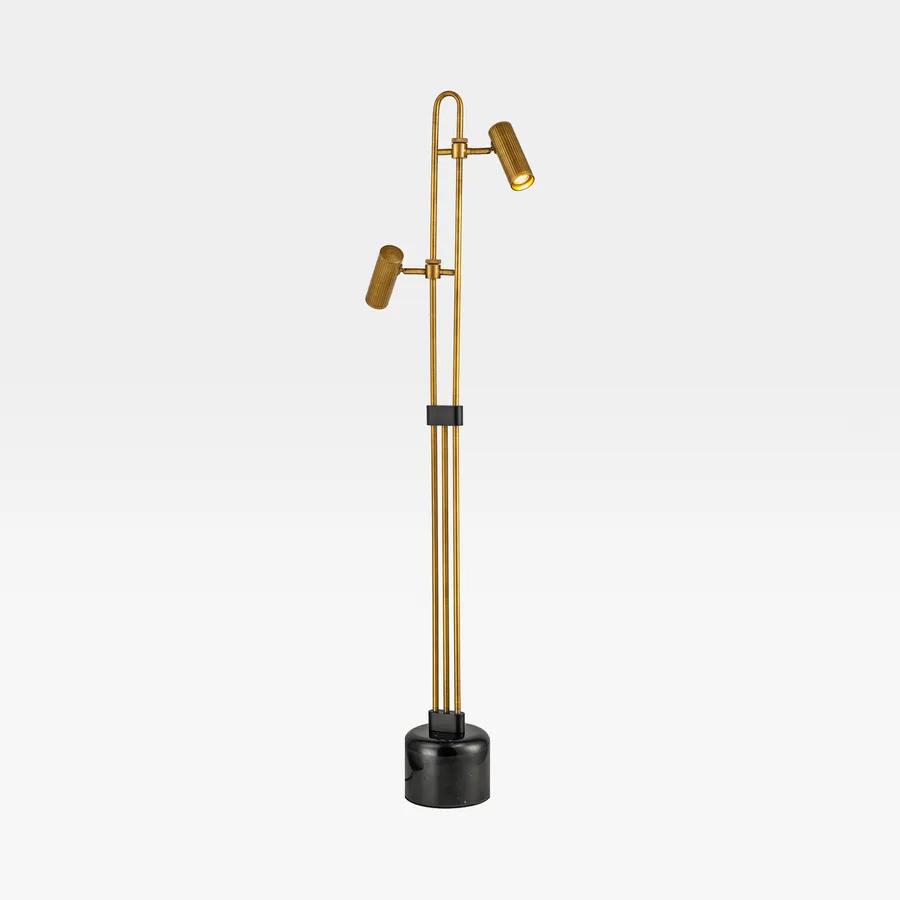 This tall gold floor lamp features a sleek silhouette with dual spotlight heads inspired by stage lighting. Accented with black details, its striking design blends modern elegance with bold character, making it both a statement piece and a functional source of light.