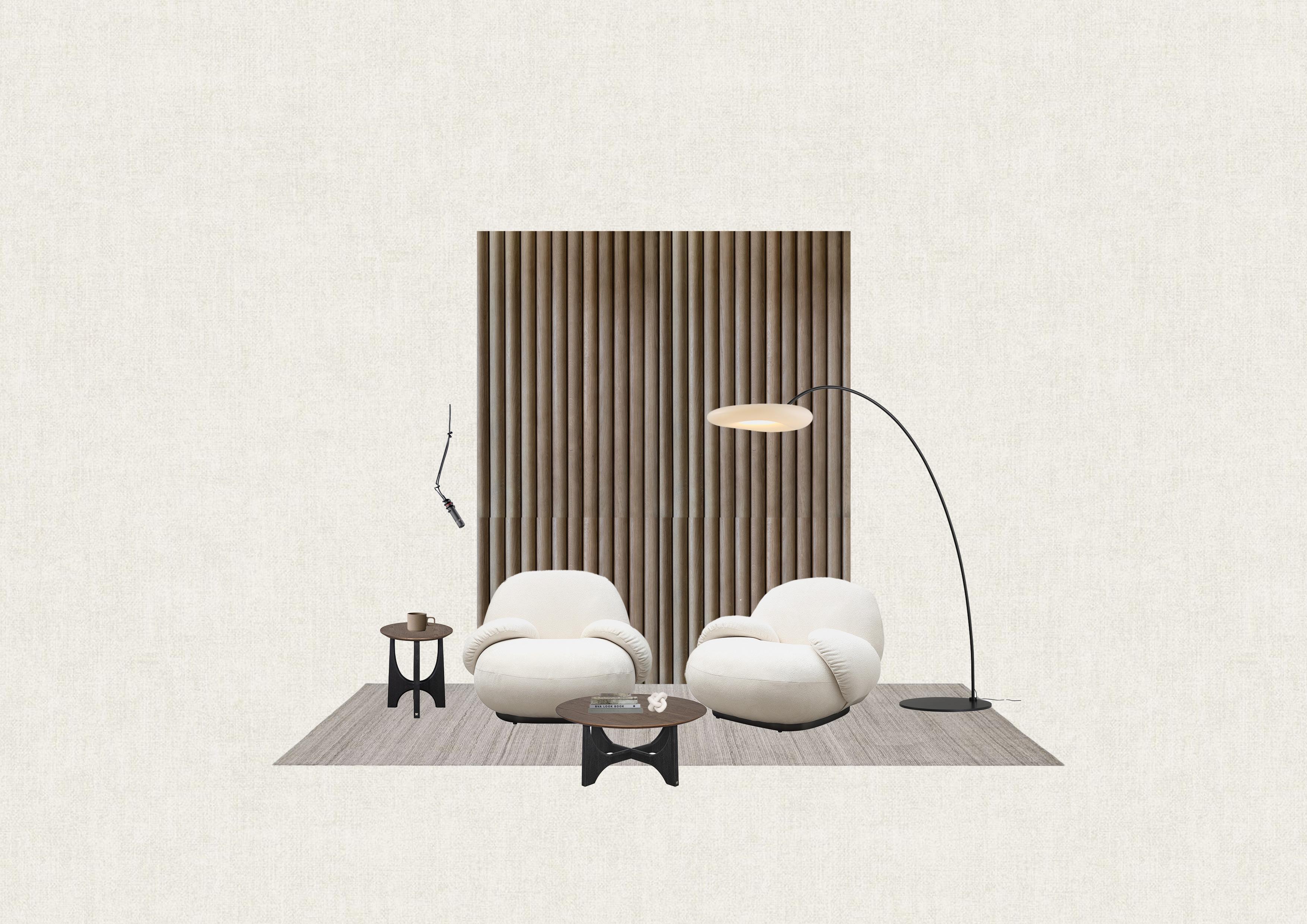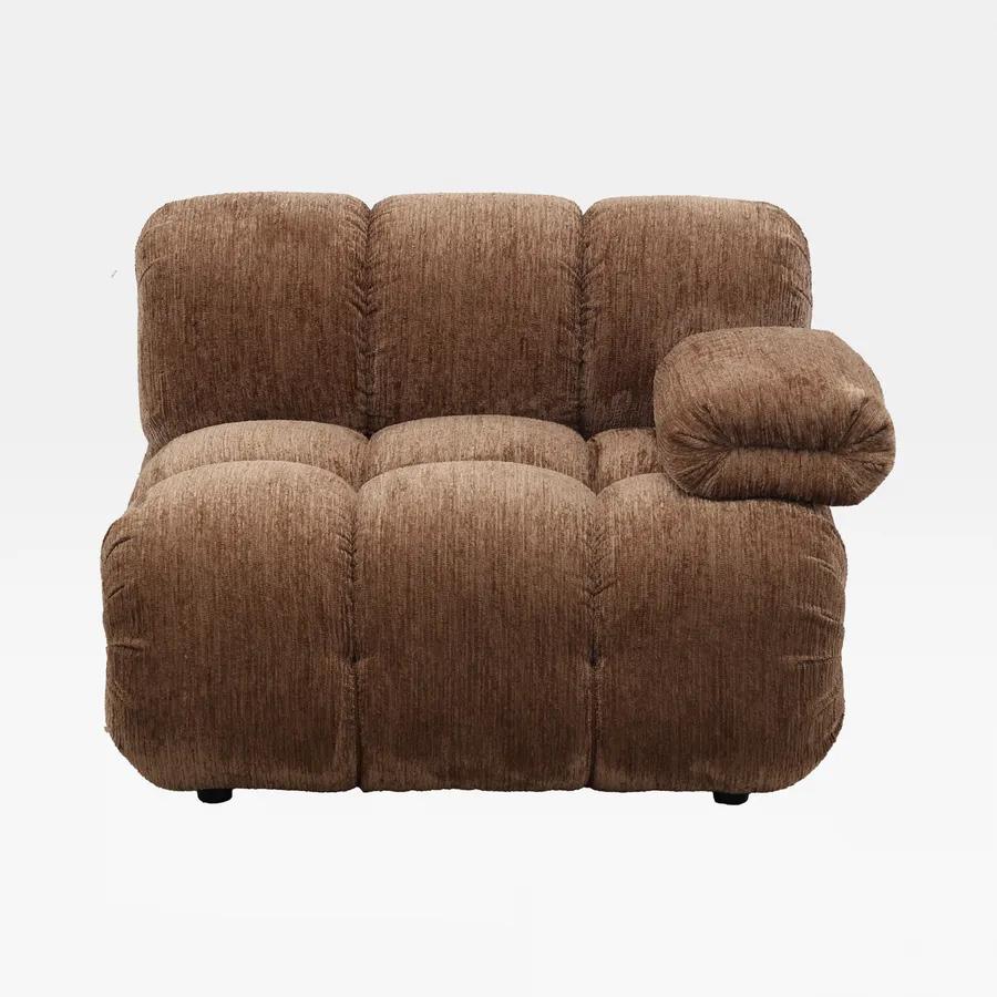SUNNY armchair channels 1970s–80s design with its plump form, deep ribbed cushions, and rich velvet upholstery. A low-profile silhouette blends Postmodern and Italian influences, delivering casual comfort with a sculptural, statement-making presence.