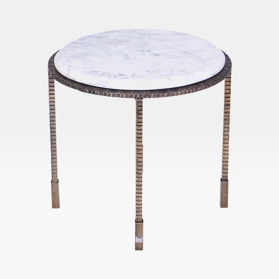 The Twine side table combines sculptural charm with playful texture, featuring hand-forged iron legs in antique brass and a smooth white marble top. Perfect solo or paired, it balances sophistication with effortless style.