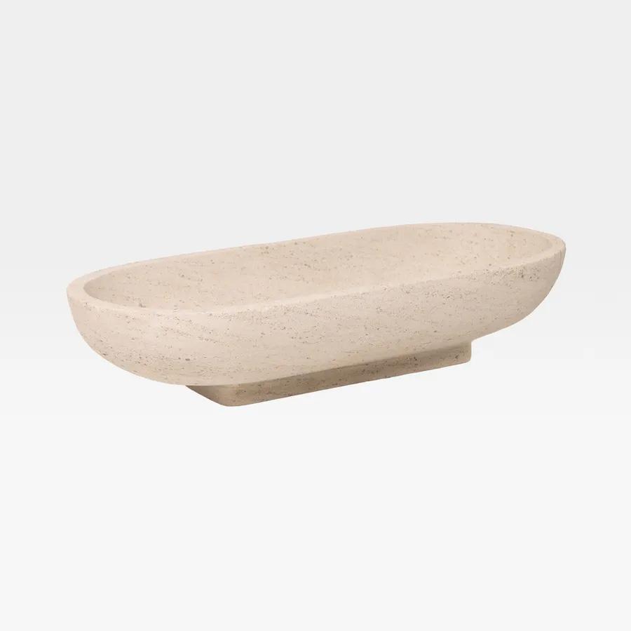 Carved from Indian Travertine, the Orionis tray showcases naturally aged textures and soft veining. Its elongated oval form and low rim create a minimalist, modern silhouette, making each eco-friendly piece quietly elegant.