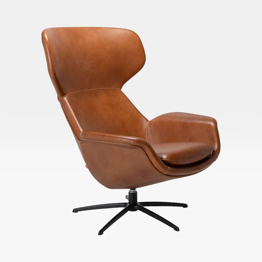 TODD swivel armchair merges modern comfort with mid-century charm. Its clean lines, structured form, and smooth top-grain leather exude elegance. The swivel base adds versatility, making it a stylish and functional piece for any space. DESCRIPTION