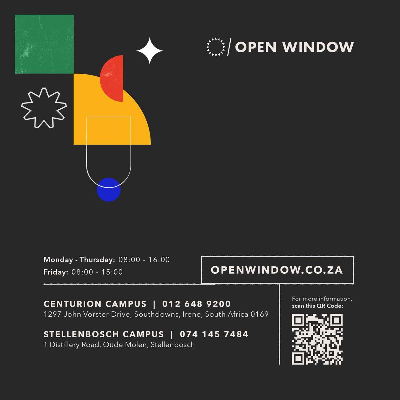 With thriving campuses in Centurion and Stellenbosch, and a brand-new Johannesburg campus on the horizon, Open Window continues to expand its creative footprint across South Africa. Both campuses house specialist facilities – from advanced studios and cuttingedge equipment to dedicated creative spaces – ensuring our students have the tools to turn vision into reality. Our growth is driven by a bold commitment to innovation, industry relevance, and a unique creative edge that keeps us at the forefront of higher education in the arts and technologies.