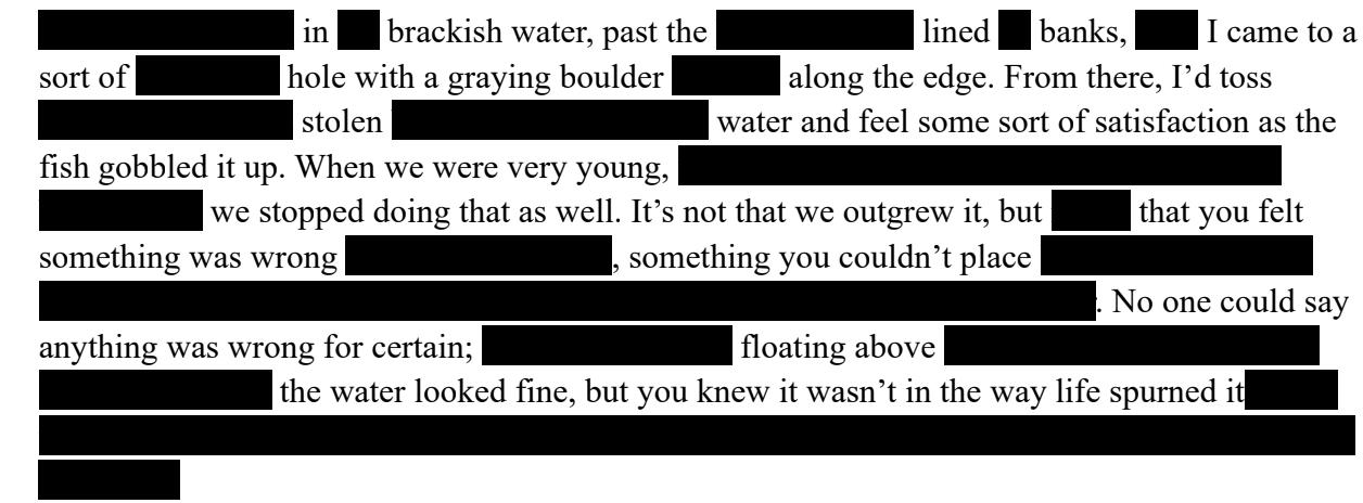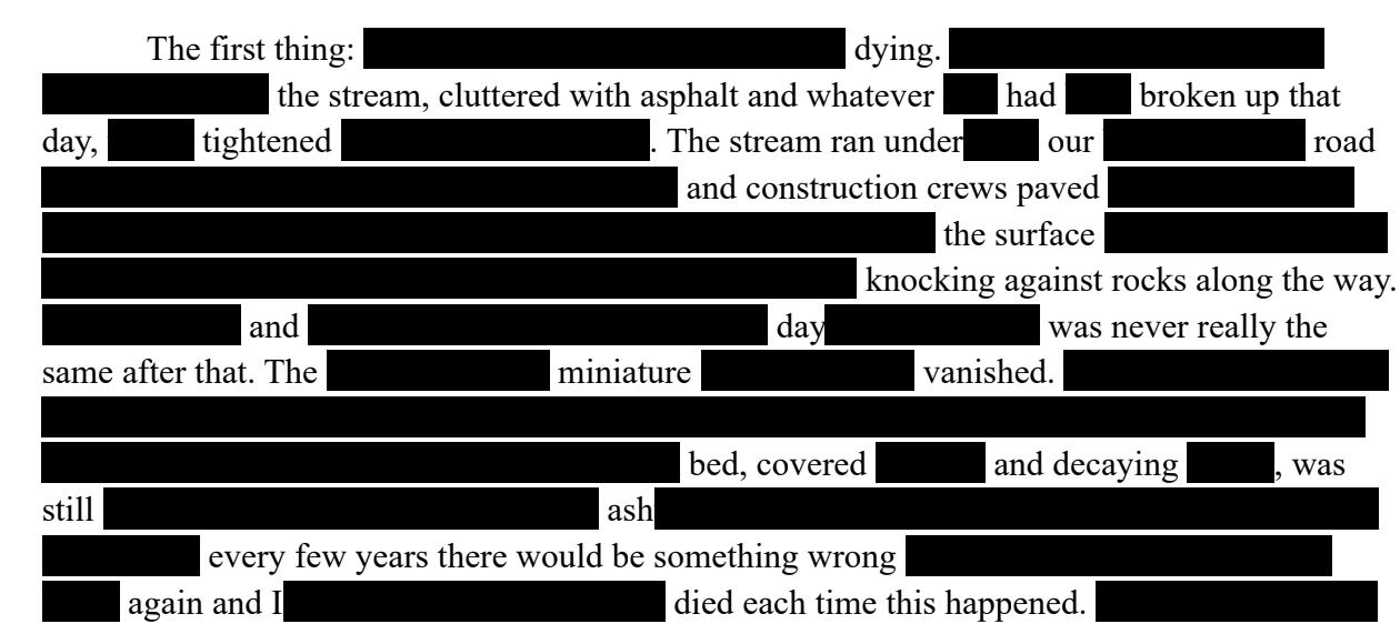 The first thing: the fish in the stream by our house dying. A construction worker was looking down at the stream, cluttered with asphalt and whatever else had been broken up that day, with a tightened expression on his face. The stream ran underneath our busy suburban road through a tunnel, and that day the road closed and construction crews paved over where it ran. The stream didn’t look polluted after that, but the fish all rose to the surface anyways and drifted downstream, their bloated corpses expanding with gas and knocking against rocks along the way. The pavement and asphalt floated away or sunk that day, but the stream was never really the same after that. The crawdads, those miniature lobsters, all but vanished. They’d lain underneath the muddy rocks beneath the water, and I’d always hoped that eventually I’d find one near as big as the lobsters in stores. The creek bed, covered in stone and decaying leaves, was still gray and silty with broken rock and ashy sand. The road ran alongside the stream as well as over it, and every few years there would be something wrong with it and construction would begin again and I’d wonder if the bigger fish died each time this happened. Sometimes, I’d hike through the stream in the brackish water, past the backyards that lined its banks, until I came to a sort of swimming hole with a graying boulder perched along the edge. From there, I’d toss frozen corn from a stolen bag into the waist-deep water and feel some sort of satisfaction as the fathead minnows gobbled it up. When we were very young, we’d swim there, wading in slowly from the boulder, but we stopped doing that as well. It’s not that we outgrew it, but rather, that you felt something was wrong when you waded in, something you couldn’t place but could feel in the lack of life, in the sudden thought that you didn’t want to put your head under. No one could say anything was wrong for certain. It was like the fish floating above clear water: eventually they floated away and the water looked fine, but you knew it wasn’t in the way life spurned it, in the way only water spiders skated across its surface and frogs lived upon its banks and nothing lived beneath it. The Opiate, Spring Vol.