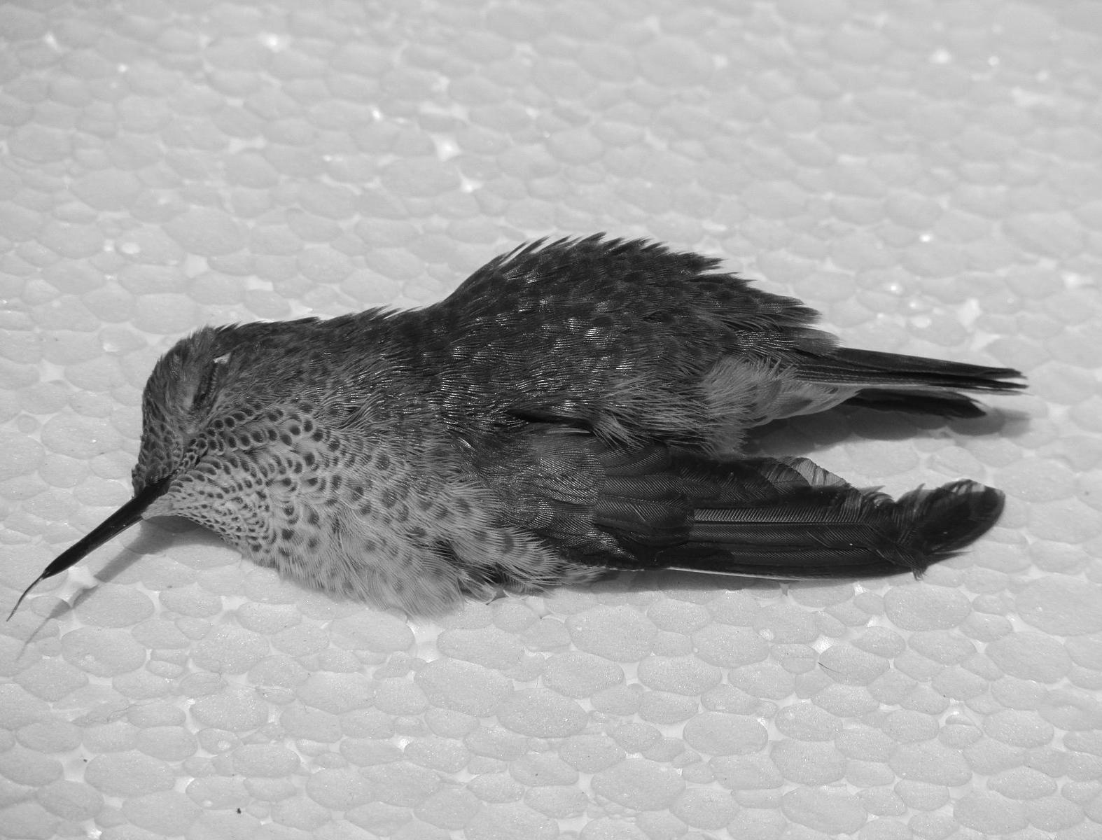 A cardinal flew into the yard from across the street and had a dead green hummingbird in its beak.
