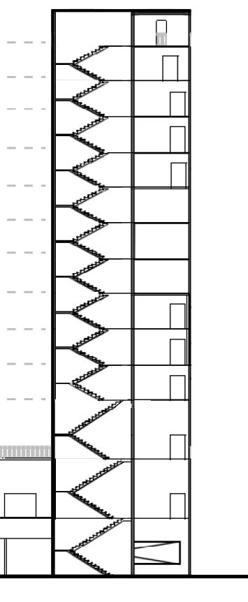 Resultado da simples ligação entre as empenas dos dois prédios vizinhos, a forma deste edifício é mais convencional. Porém, a planta tipo que se repete nos seus 10 andares foi pensada para fomentar a interação entre os habitantes daquele pavimento. Seis quartos individuais com banheiro próprio, compartilham tanto a cozinha quanto o espaço multiuso que pode servir de sala de estar ou um ambiente de trabalho e estudos.