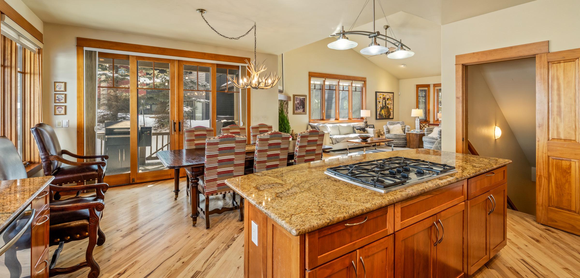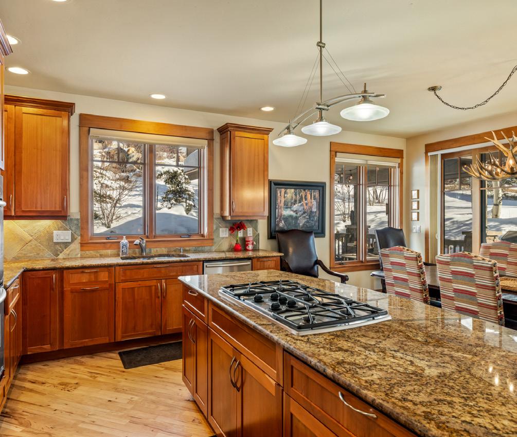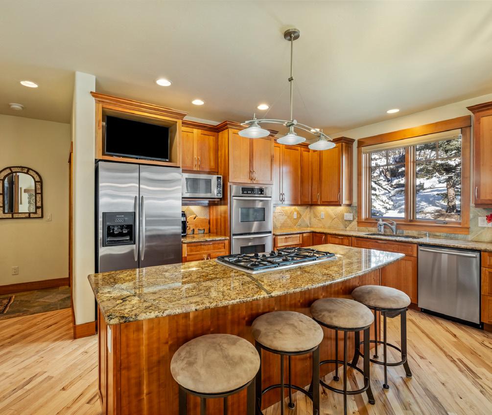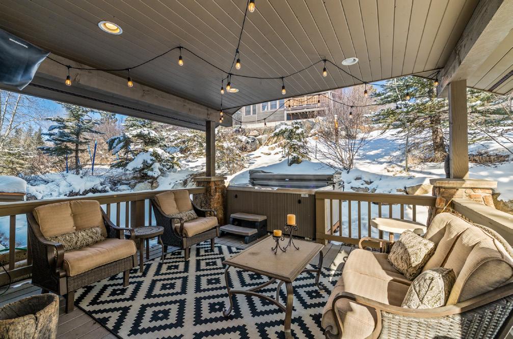 The adjacent dining area and chef’s kitchen feature granite countertops, dual ovens, and a large center island, opening to a covered back deck with hot tub, private yard, and ski area views, perfect for indoor-outdoor living. Walk-in pantry and exceptional storage throughout.