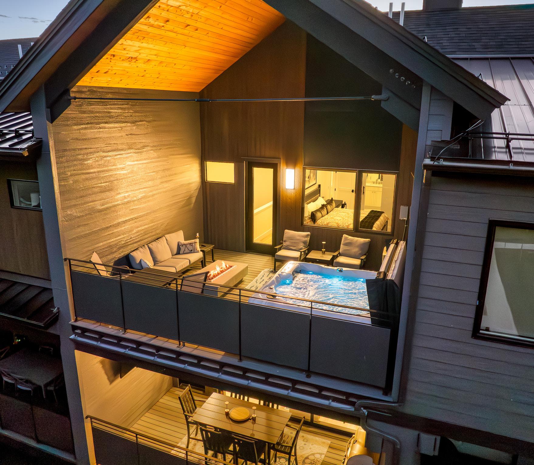An outdoor lounge shares the top floor with hot tub, fire pit, and ski area views, and a junior suite offers Emerald Mountain views.