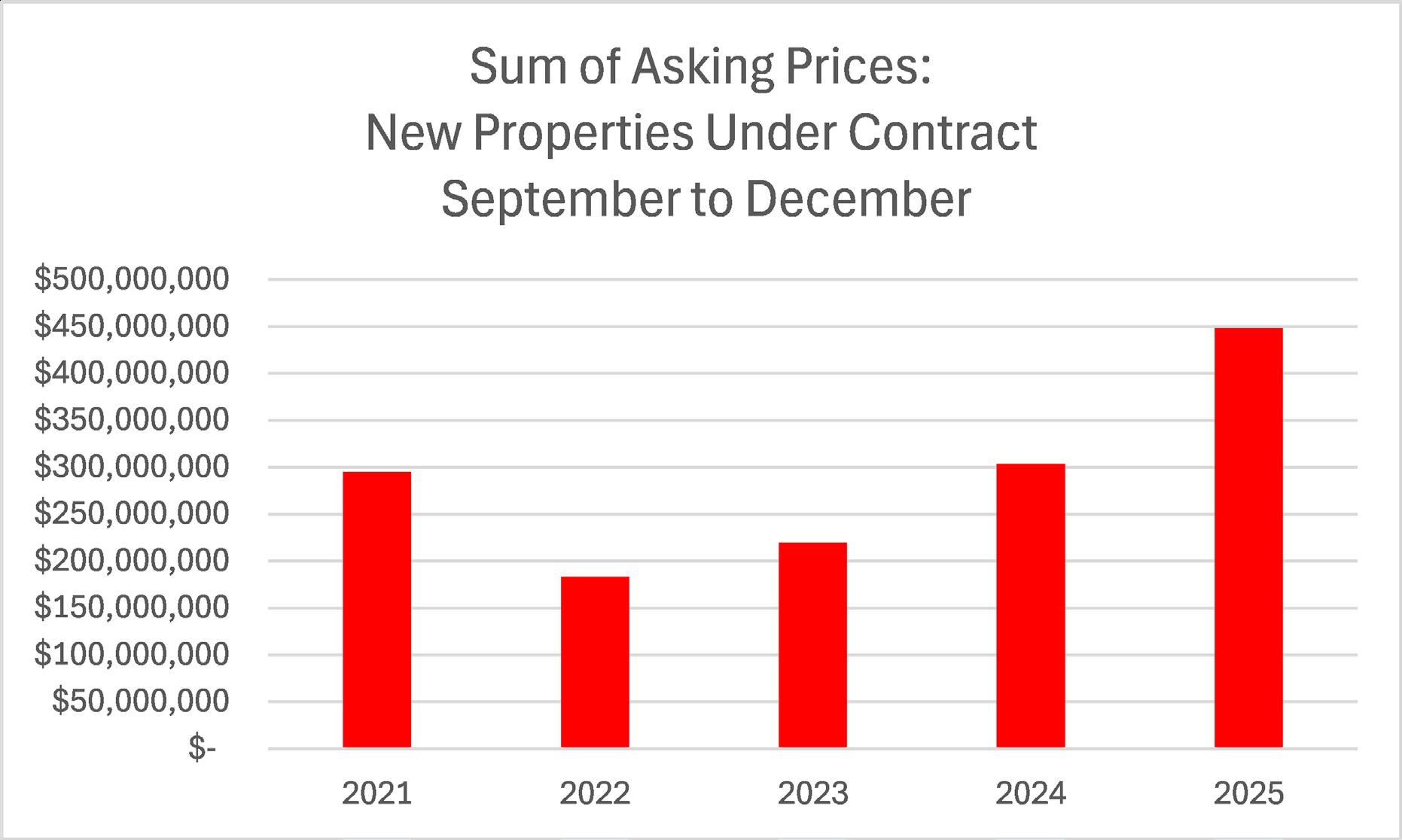 The market closed 2025 with a surge that caught many off guard. Activity accelerated in the final stretch, and the scale of that shift only became clear once the numbers were finalized. From September through December, the average asking price of properties that went under contract was 48% higher than the same period in 2024. Compared to 2022, it was 145% higher. That is a material shift in late-year pricing and a decisive finish to the year.
