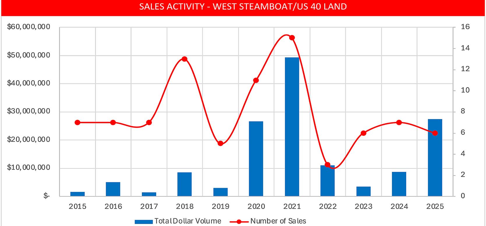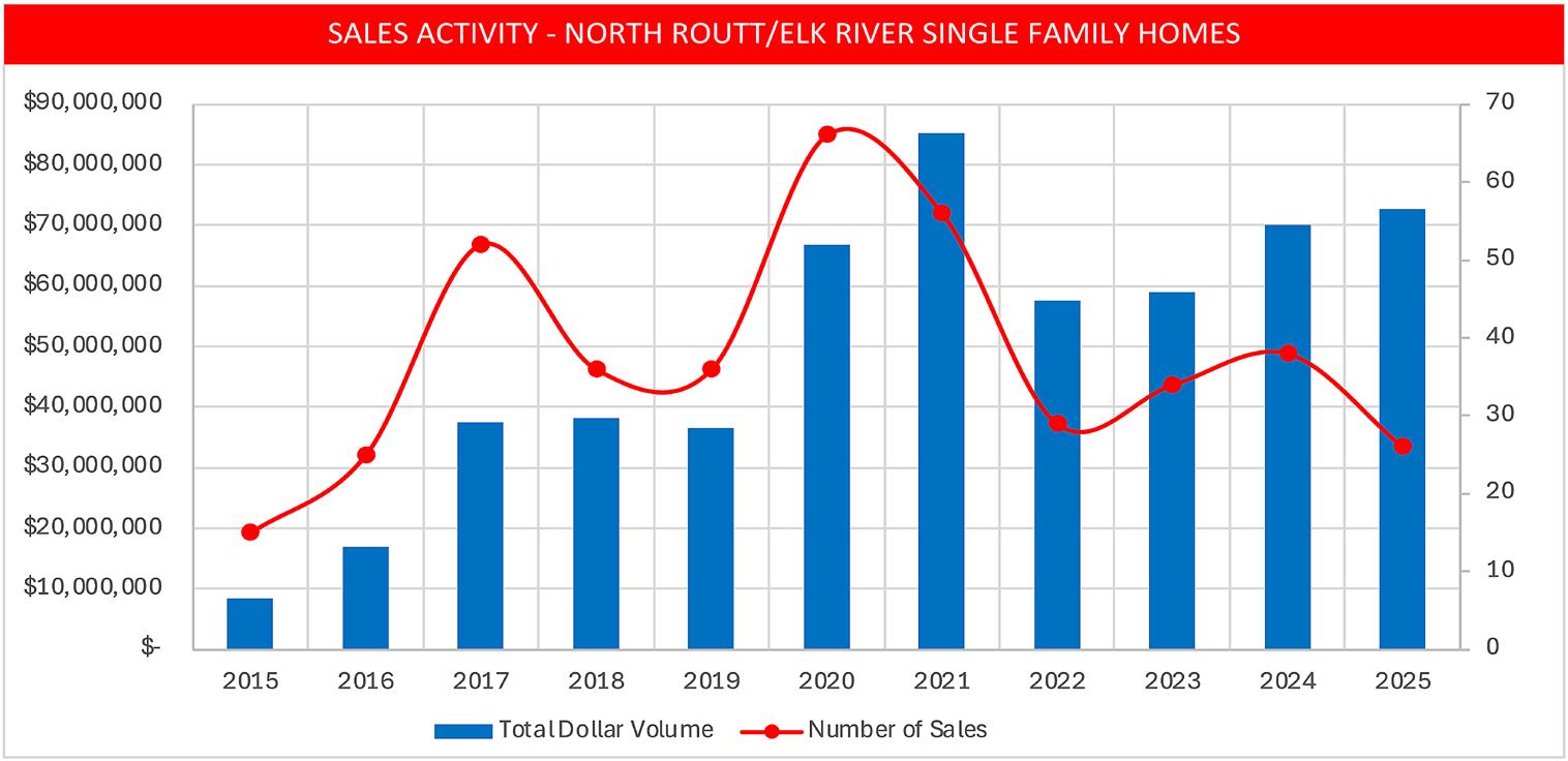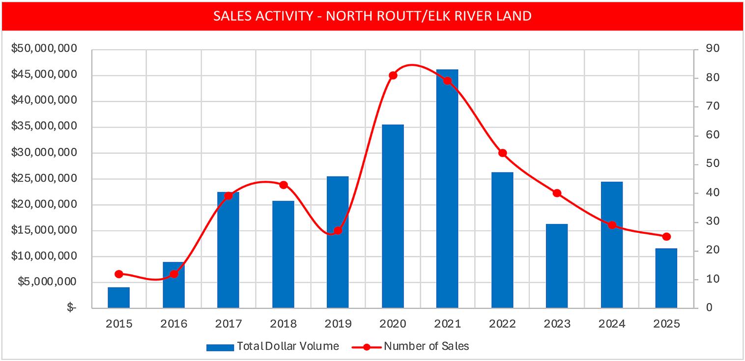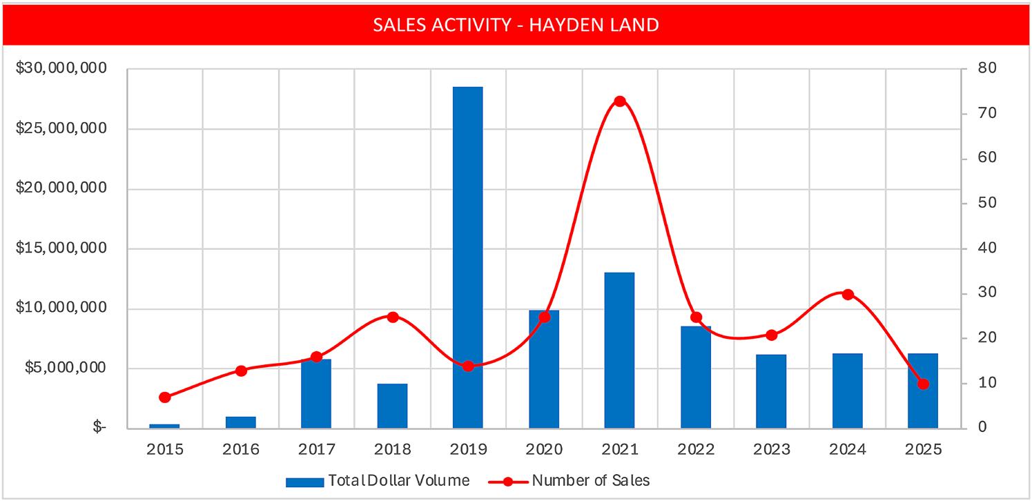 • Land sales in the region were down 61% from 2024. Declining land sales is a trend we see throughout Routt County in 2025. Possible causes include the high cost to build and the lack of vacant land supply.