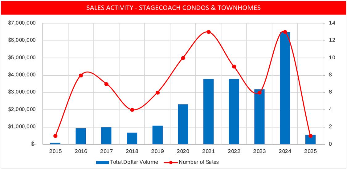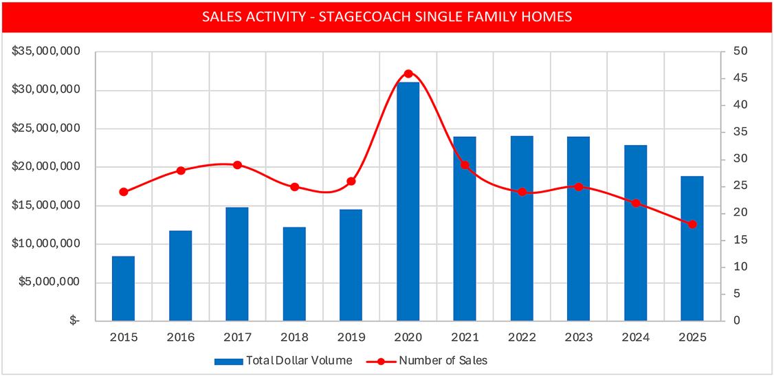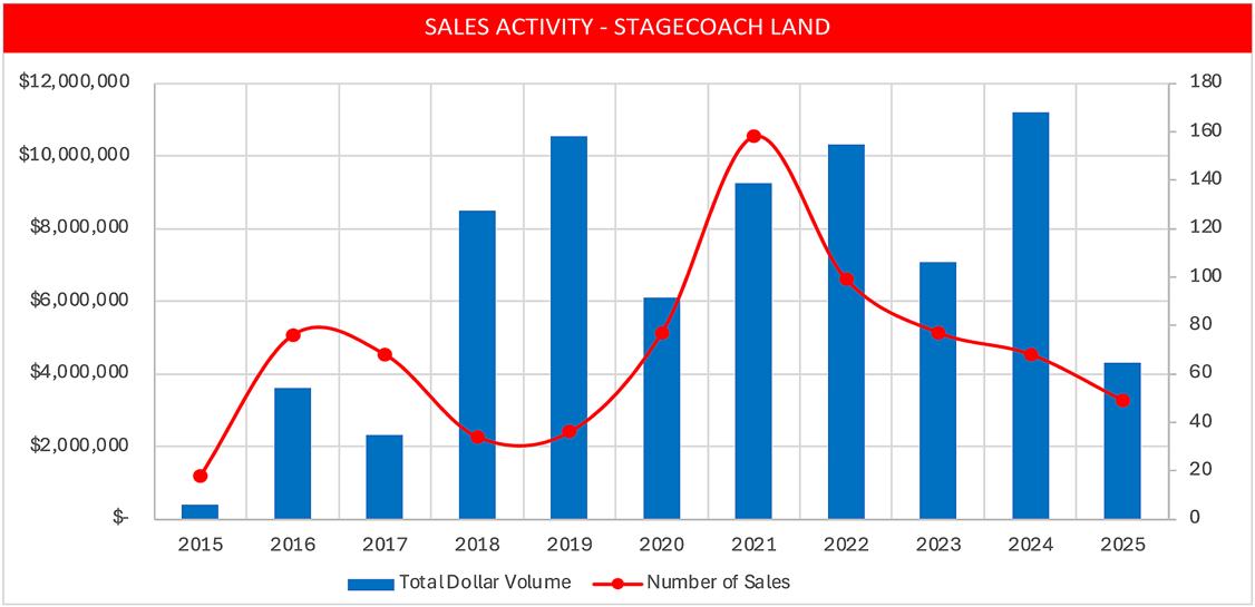 • Land sales in Stagecoach fell drastically by 61%. Speculation over the new Discovery Land project and its potential impact on pricing may be influencing potential sellers, who are waiting to sell until a possible market upturn materializes.