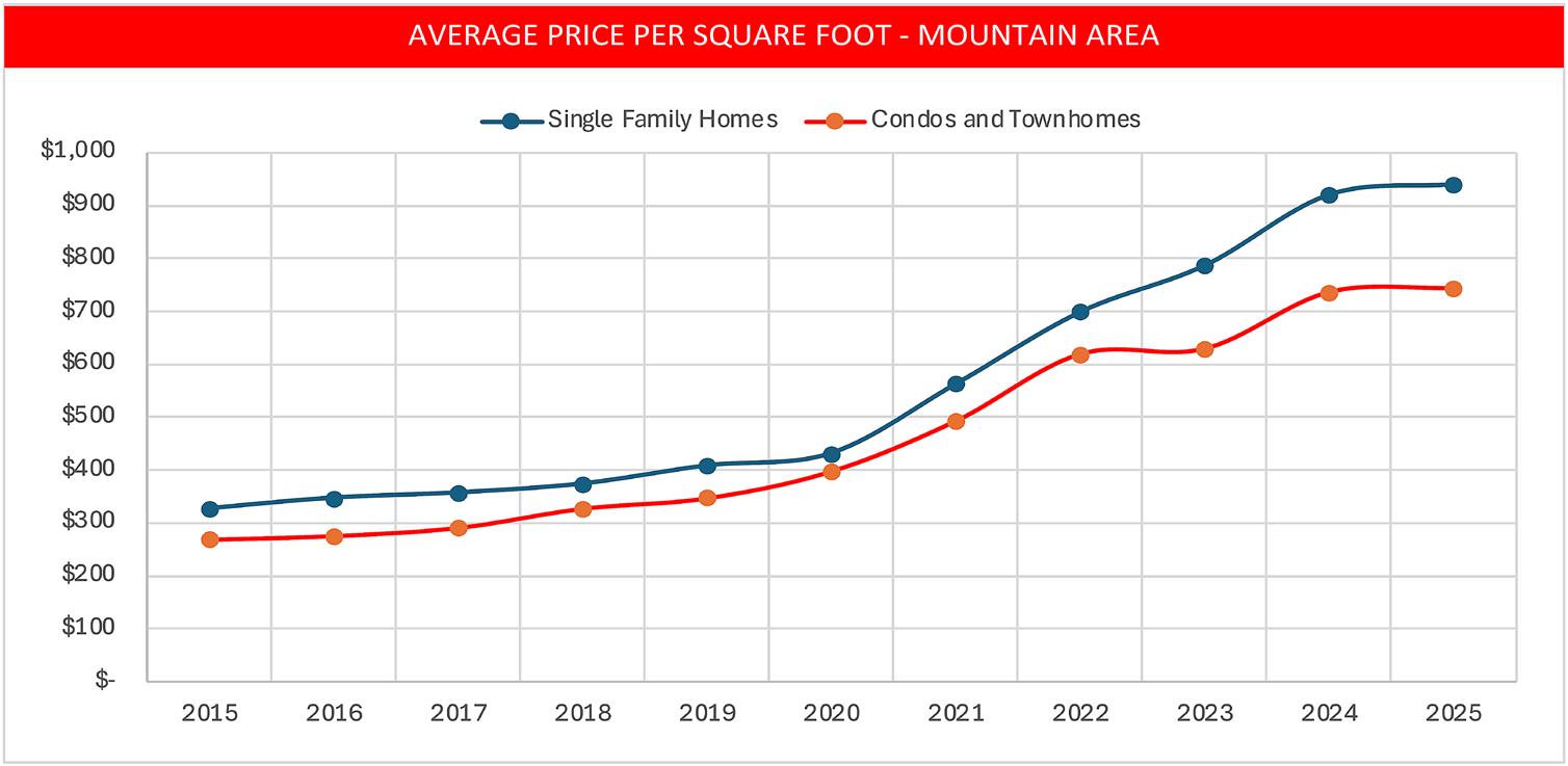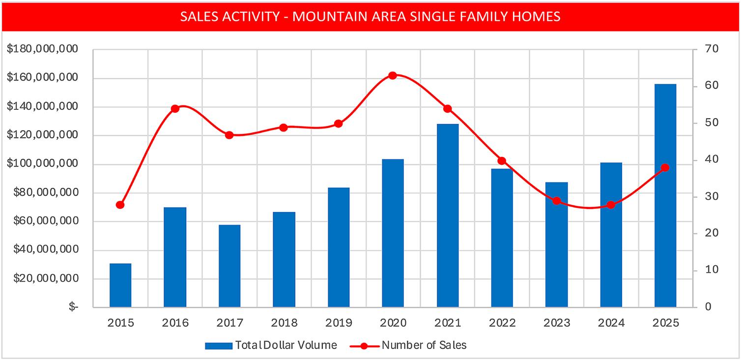 • 2025 was a record-setting year for single-family homes in the Mountain Area. Total volume sold was 20% above the previous high mark in 2021 during the COVID boom.