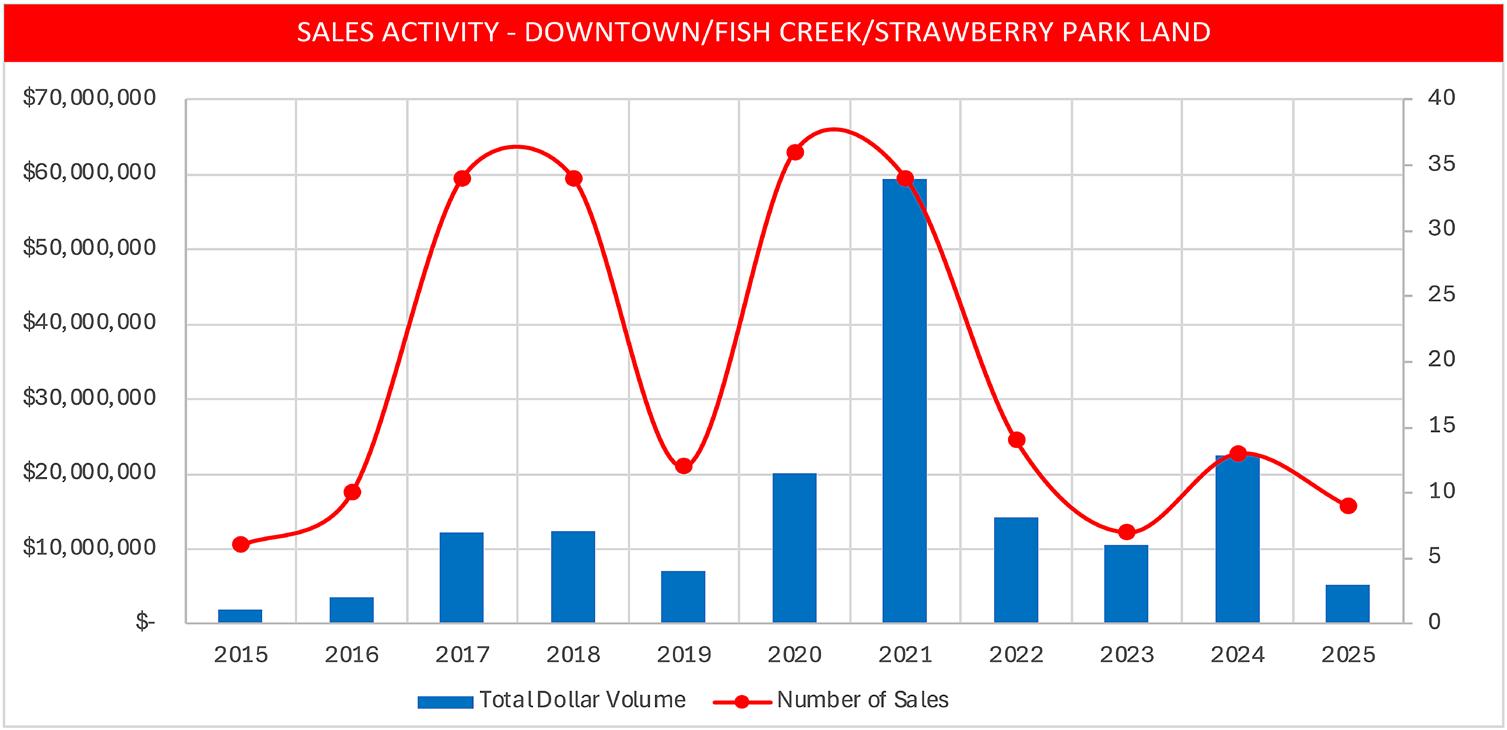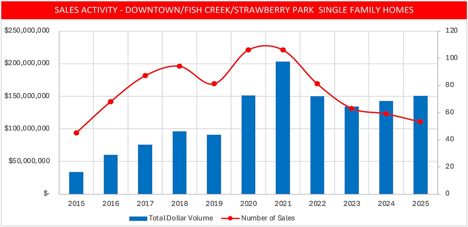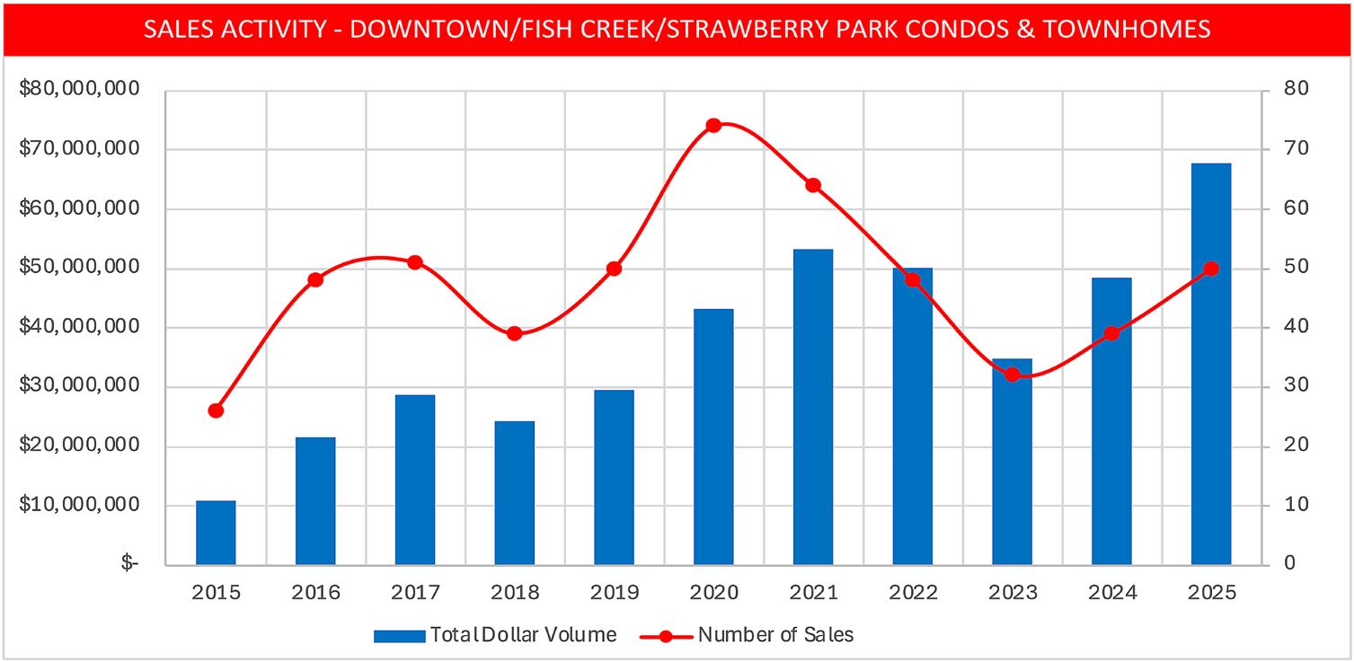 • 2025 was a record-setting year for Downtown/Fish Creek condos and townhomes, with total dollar sales volume coming in at 20% above the previous high mark of 2021.