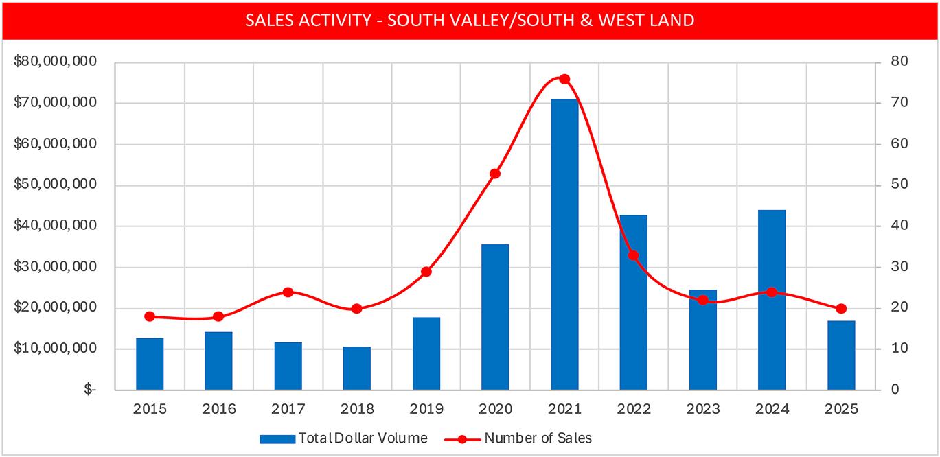 • The total dollar value of land sold returned to near 2016 levels, with a 50% decrease in volume from 2024.