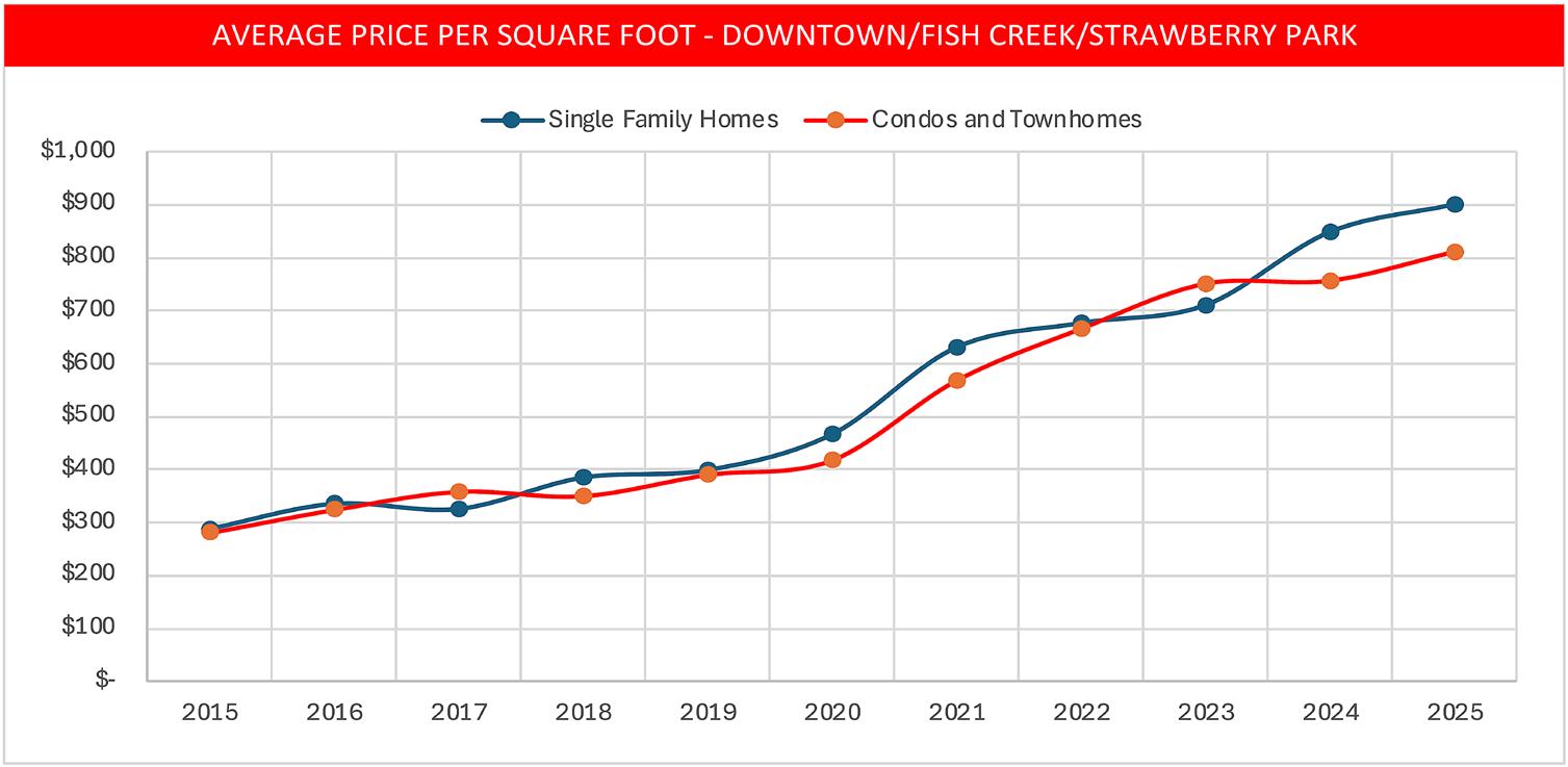• Our analysis groups the Downtown, Fish Creek, and Strawberry Park areas. However, there is a 45% difference in average price per square foot between townhomes, duplexes, and condos downtown vs. Fish Creek.