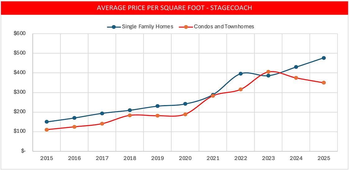 • Contrary to single-family home prices, the average price per square foot of townhomes and condos in Stagecoach is trending down for the third year. This indicates a potential area of opportunity.