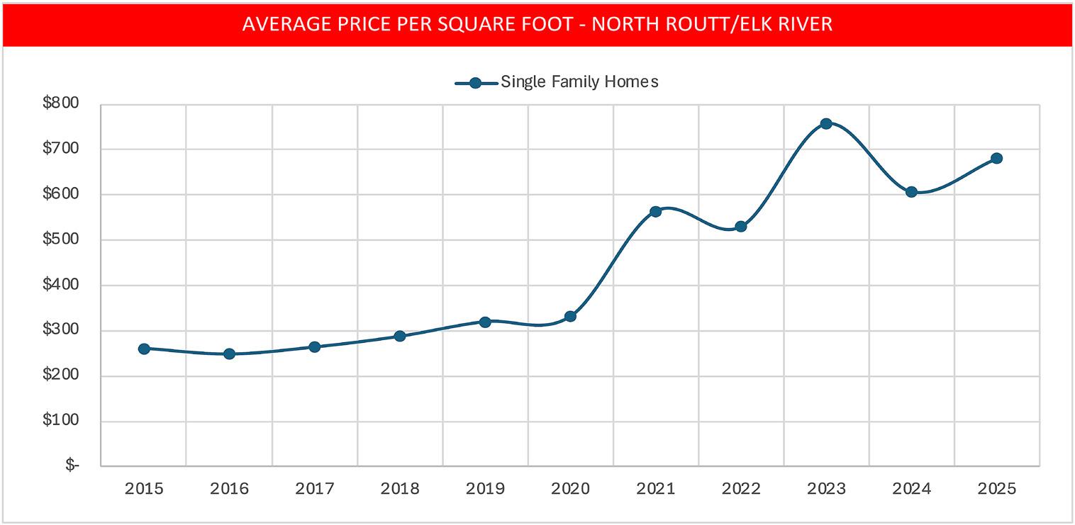 • Average price per square foot has increased in every area of Routt County with the exception of Oak Creek/Yampa/ Toponas, which has a slight decline of 2%.