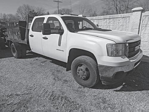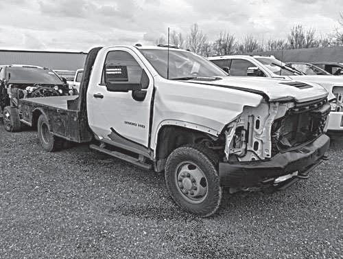 Single cab w/Knapheide steel dump box, fold-down sides, elect. over hyd., Duramax diesel, 4WD, automatic trans., 54,000 mi., runs/drives well, clean body, salvage title due to previous bed dmg. that has been repaired, ready to work.