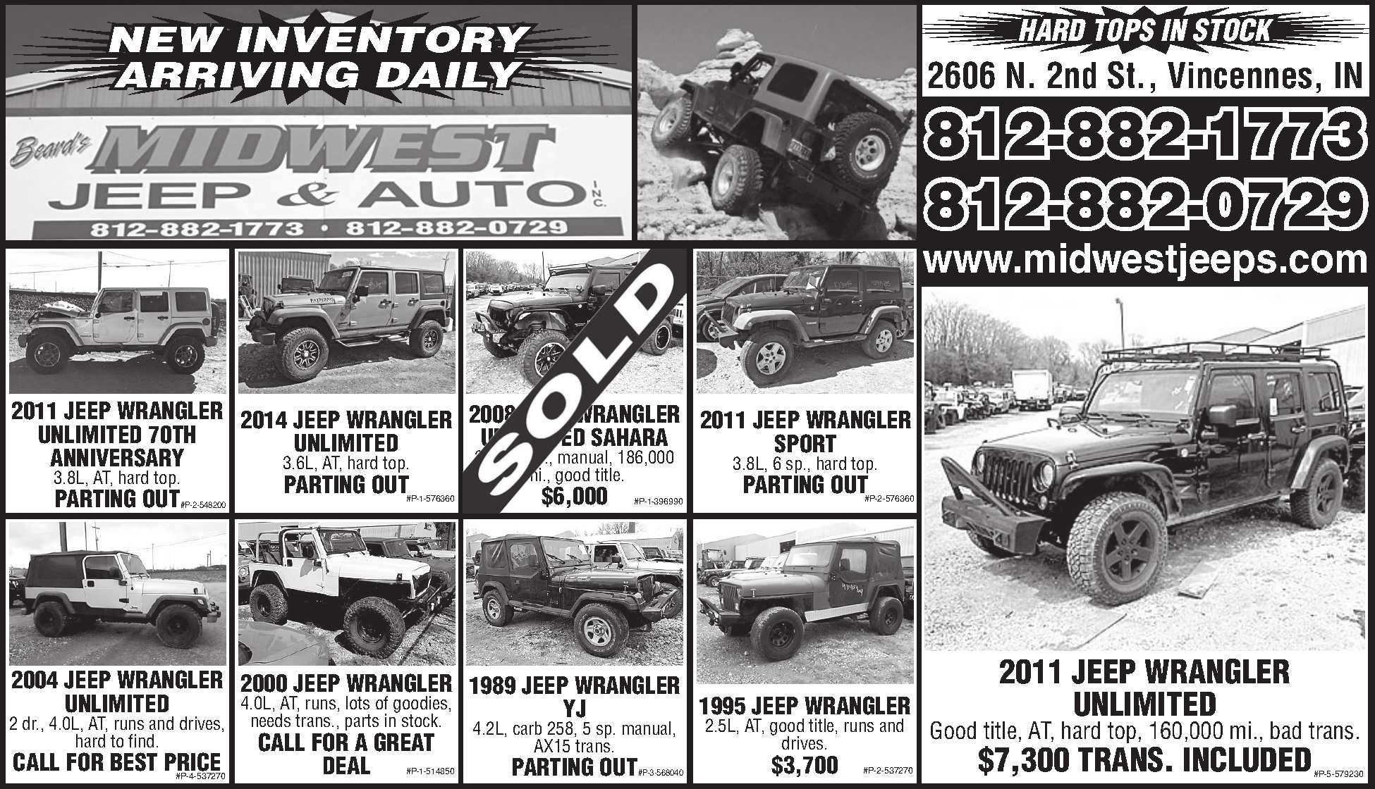 2007JEEPWRANGLERX. 4x4,6cyl.,6 sp.manual,AC,fullsteeldoors,softtop, zerorust,aluminumwheels.$12,500. Financingavail.withapprovedcredit. Wrangler/Vettetrades. J&SMotors,Fairmount,IN. 765-948-5566,jsmotors.com