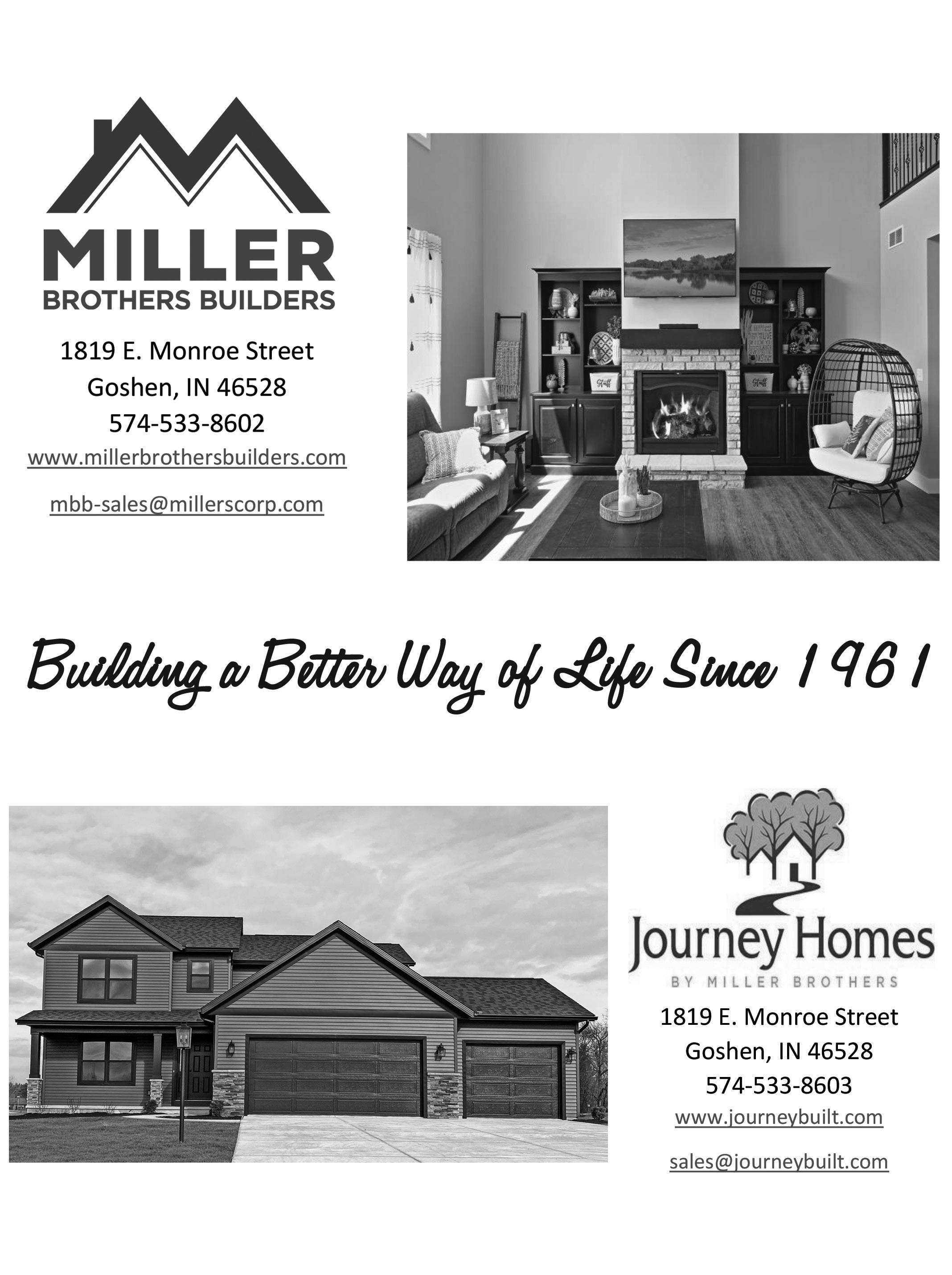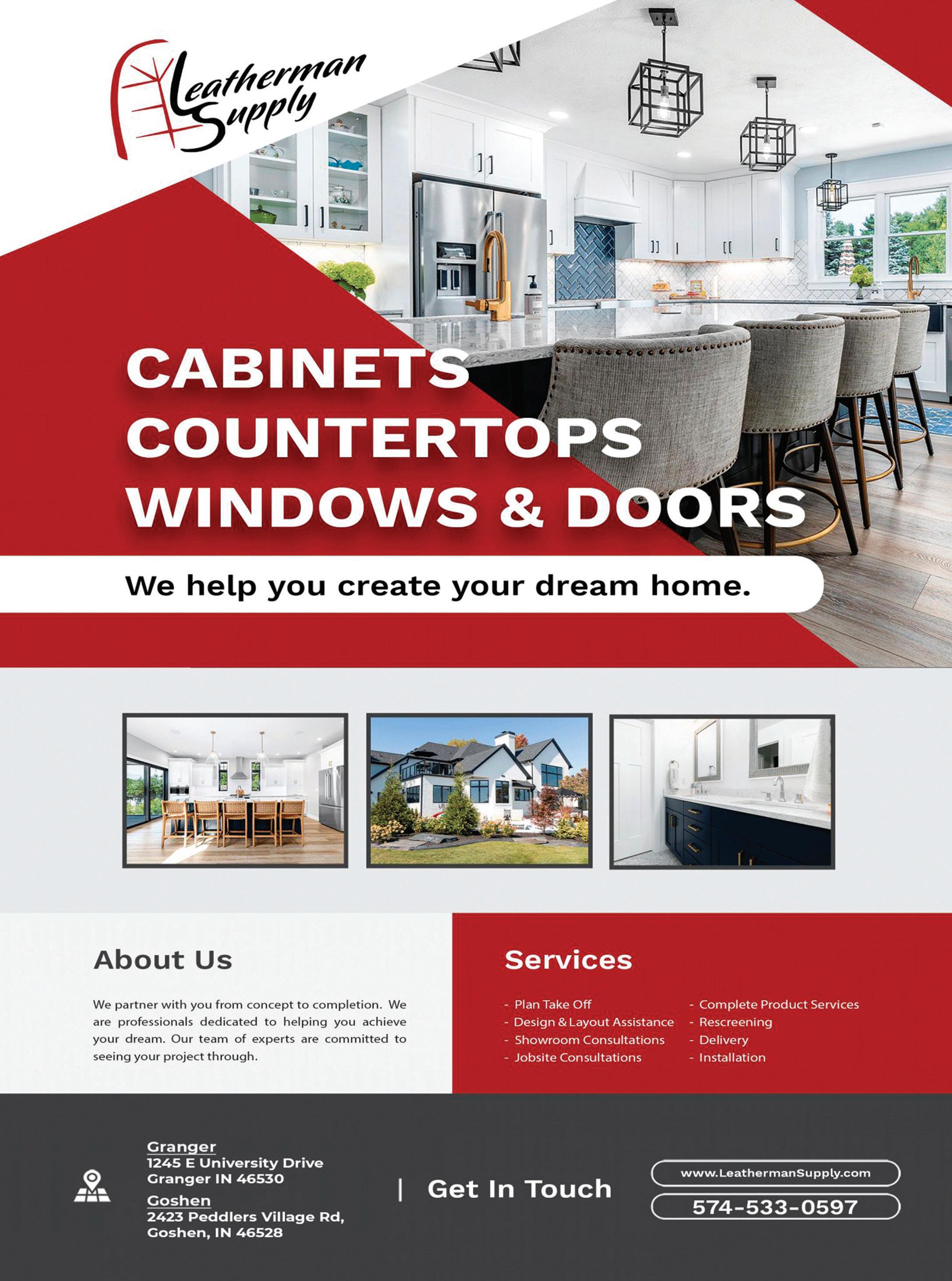 Builder Homes ......................................................................................................................................................... 26-27 BUILDERS INDEX ABC Supply Co. Inc. 34 Advanced Heating, Inc. 33 AirTite Insulation 34 Big C Lumber ....................................................... 6 Builders Mart of Goshen 44 Casey’s Erosion 34 Centier Bank 10 Closet Craft, Inc. 32 Dave Mark Custom Homes 41 Dave’s Lawnscaping 30 DuMor Water Specialists, Inc. 12 Family Value Flooring 36 Ferguson Bath Kitchen & Lighting 35 Fireside Homes, Inc. Back First Federal Savings Bank ......................... 30 First State Bank 13 Hartman Electric, Inc. 33 Hawkins Water Tech, Inc. 11 Hearth & Home Design Center 42 Hoosier House Furnishings 37 Hoover Lumber & Coal, Inc. 46 Horizon Bank 36 Hostetler Askew Door ................................... 38 Howard Hannah EC Real Estate 32 Inspired Custom Homes 38 Interra Credit Union 32 J & N Stone 12 JCS Fireplace & Stone 10 Jeremy’s Construction 44 Kendall Lighting Center 40 KW Yoder Construction Inc. 36,37 LaSalle Bristol Flooring Center 44 Leatherman Supply 51 Martin Brothers Contracting, Inc. ............... 2 Meridian Title Corp. 42 Michiana House & Home Magazine 46 Mid-City Supply Company, Inc. 7, 33 Midwest Waste Solutions 12 Miller Door & Trim 33 Miller Brothers Builders 45 Miller’s Building Supply, Inc. 38 Momper Installed Building Products ...... 30 Myra Simpson Designs 36 Nick’s Custom Built Homes, Inc. 47 Ozinga 46 Reliance Construction 12 Riteway Builders, Inc. 32 Schrock Homes 10 Schwartz Electric 30 Square 1 Builders 39 Southwind Flooring 10 Sun & Shade Awning 38 Surf Internet ....................................................... 42 Teachers Credit Union 40 Team Construction Co., Inc. 6 Team Remodeling 34 Town & Country Builders 43 ADVERTISERS INDEX SAVE THE DATE! February 23-25, 2024 Northern Indiana Event Center, 21565 Executive Parkway, Elkhart
