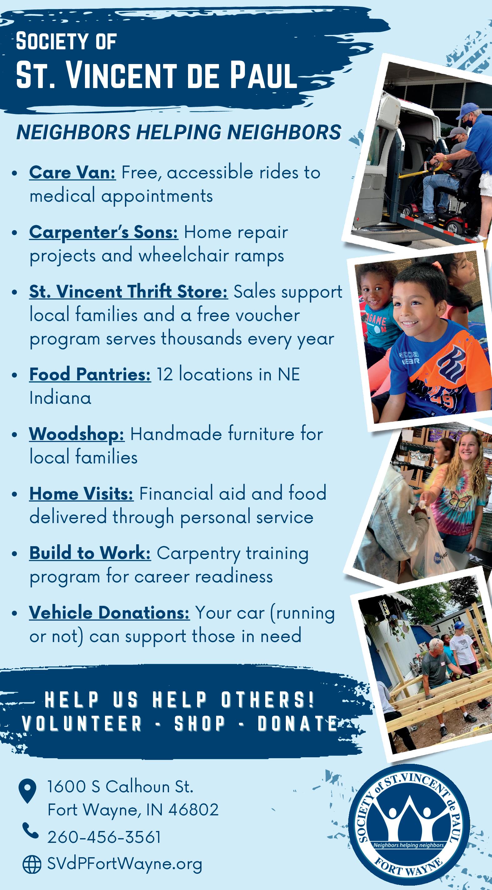 Grants awarded in 2025 included Cancer Services of Northeast Indiana, AmeriCorps Foster Grandparents Program, Stillwater Hospice, Ombudsman Program, Homebound Meals, TRIAD, Neighbor Link, Lighthouse, Community Harvest, CTN, Turnstone, The League, Society of Saint Vincent De Paul, Aging and In Home Services, Hear Care.