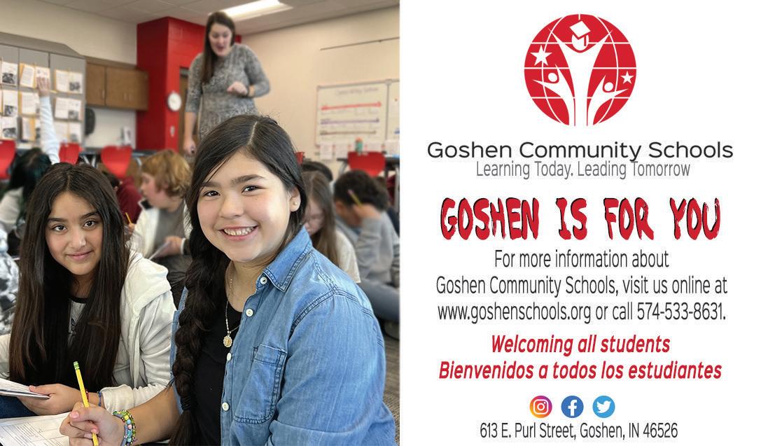 Learning today. Leading tomorrow. Now welcoming new students. For more information about Goshen Community Schools, call 574-533-8631 or visit our website at www.goshenschools.org.