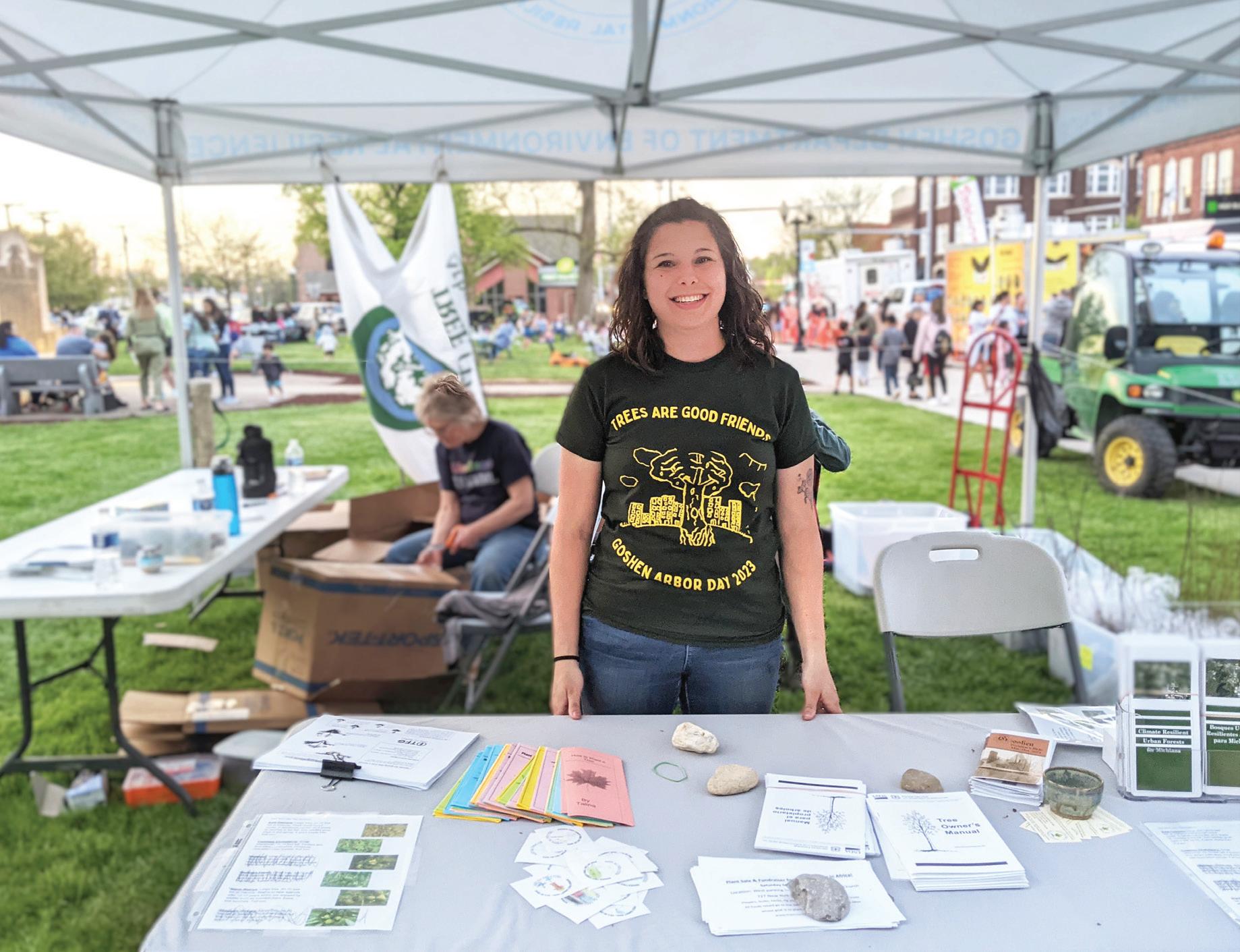 Arbor Day Celebration — Mel- anie Helmuth, urban forester for the City of Goshen, mans her booth on the courthouse lawn during an Arbor Day Celebration.