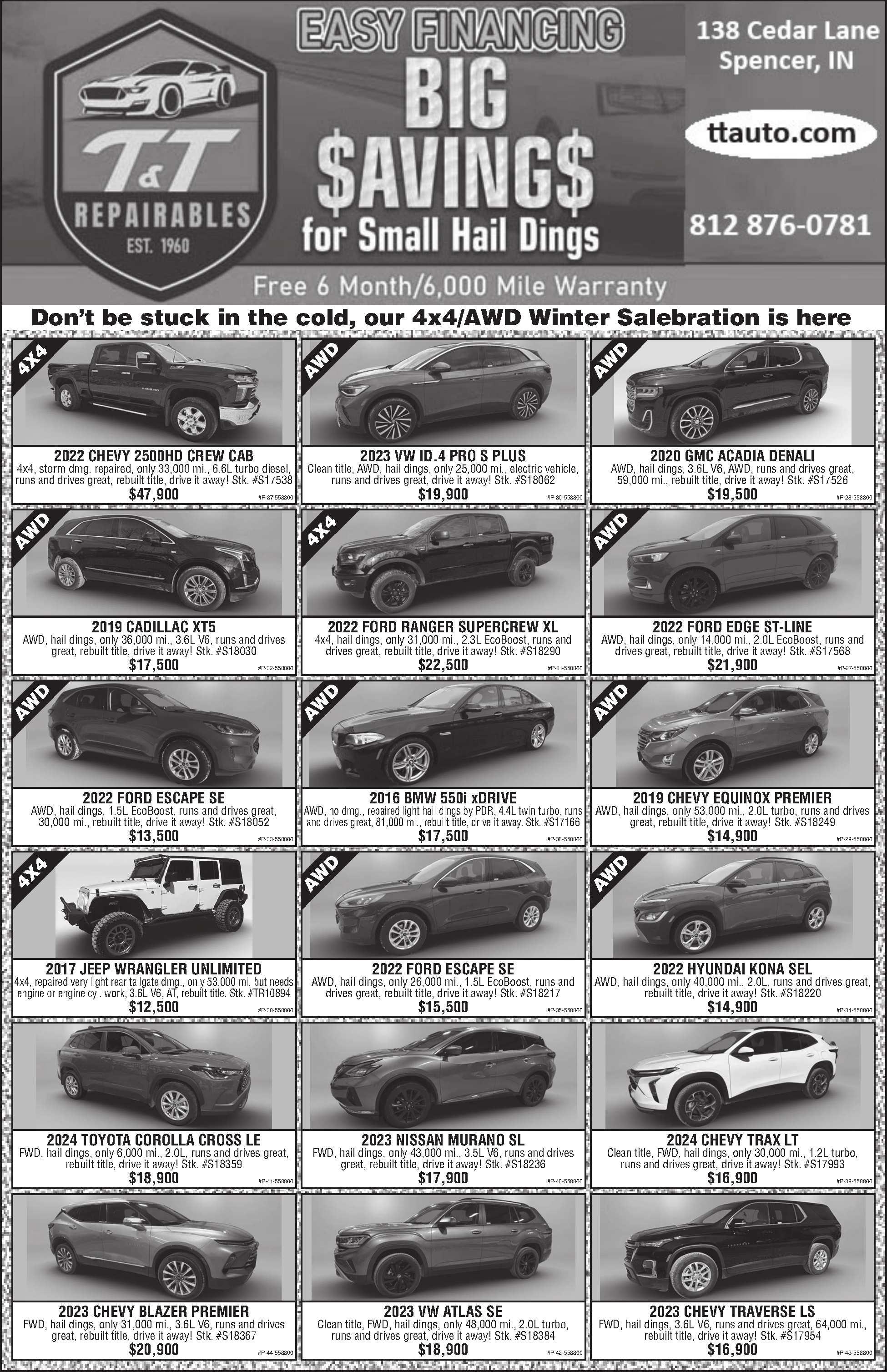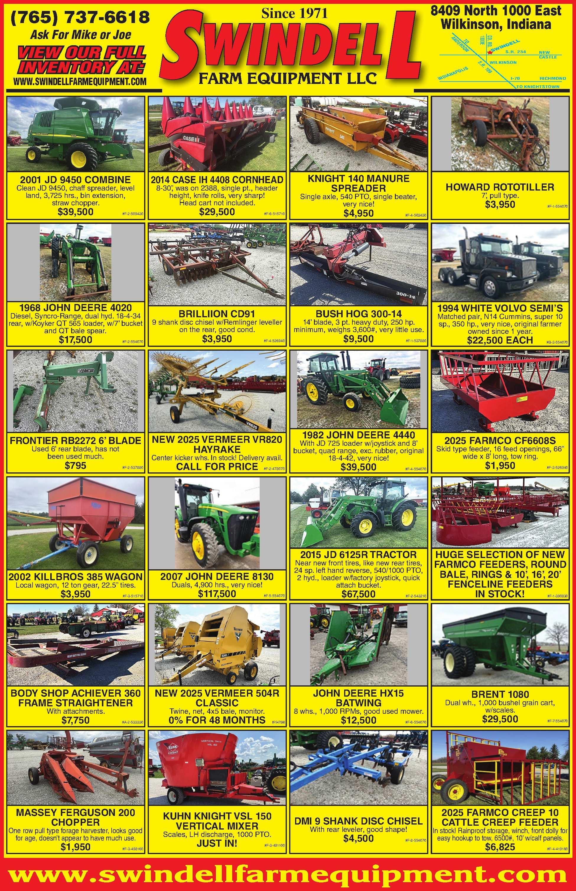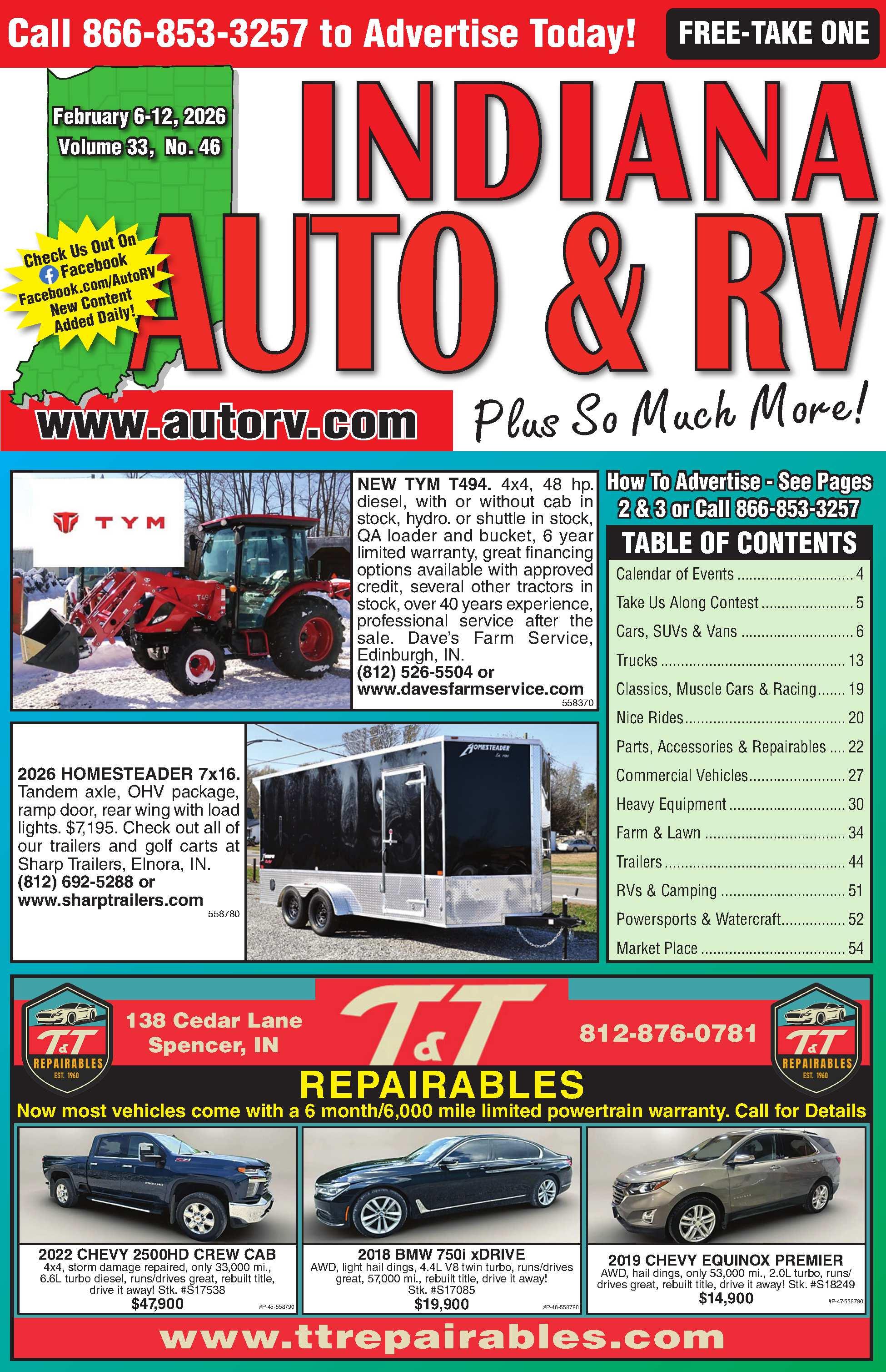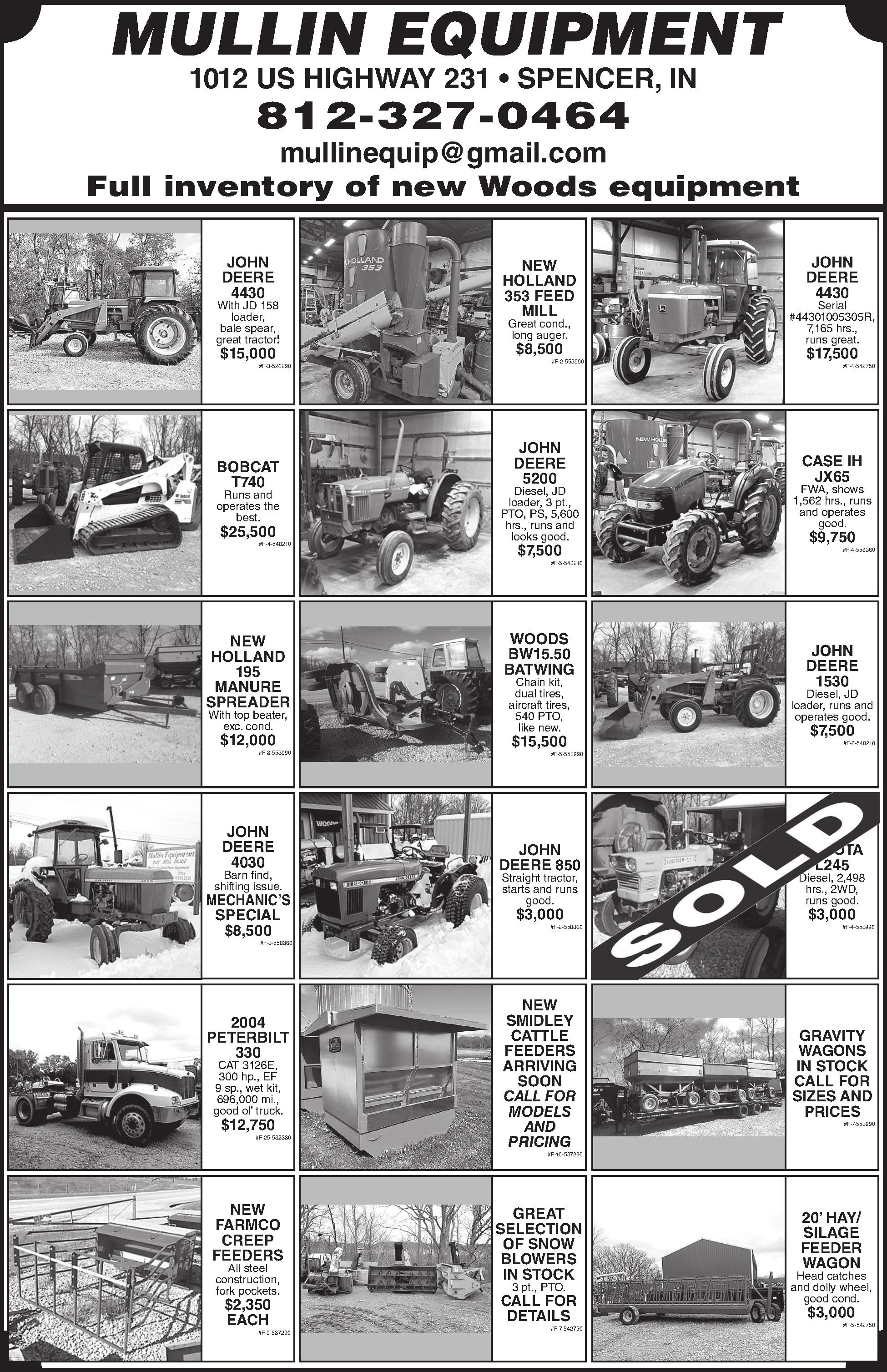ASKUSABOUTAFTERMARKETTRACTORPARTS! Starters&alternators,sales&services,SCBEasyCut sickleparts,Tornadobatteries,tractor&skidloader repairs,engineoverhauls,trans., highqualityoil,electricaltroubleshooting,customhydraulichoses,fittings& adapters.WalnutRepair,20681HawthornRd.,Argos, IN. 574-892-5968 546670