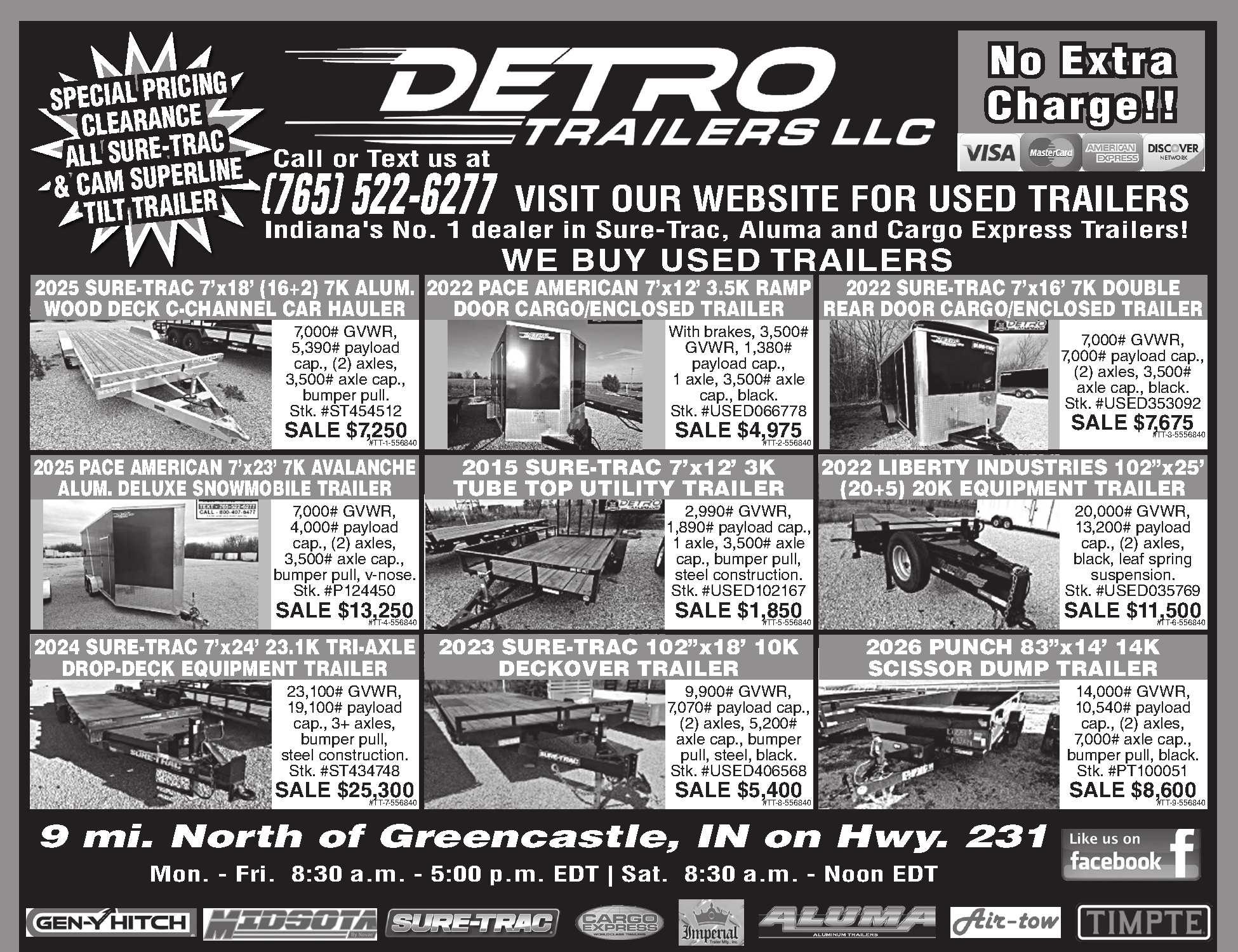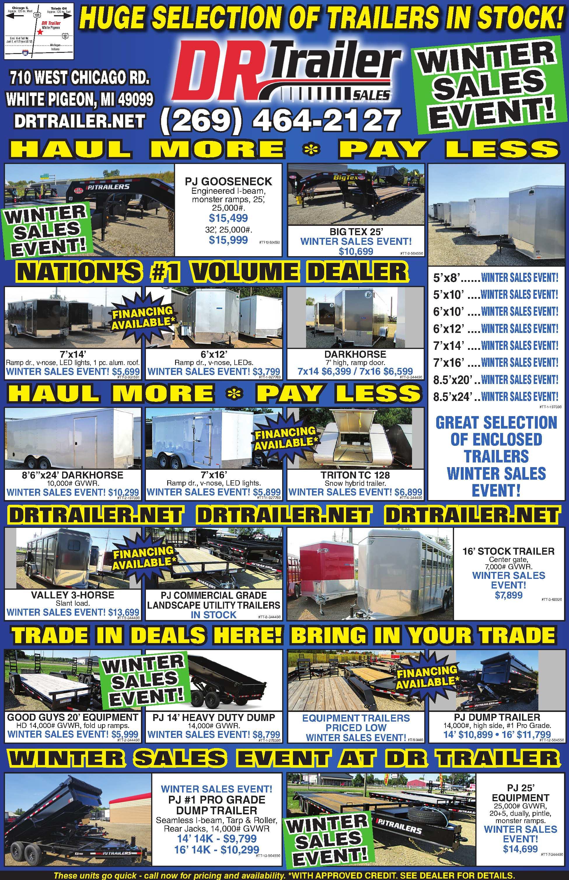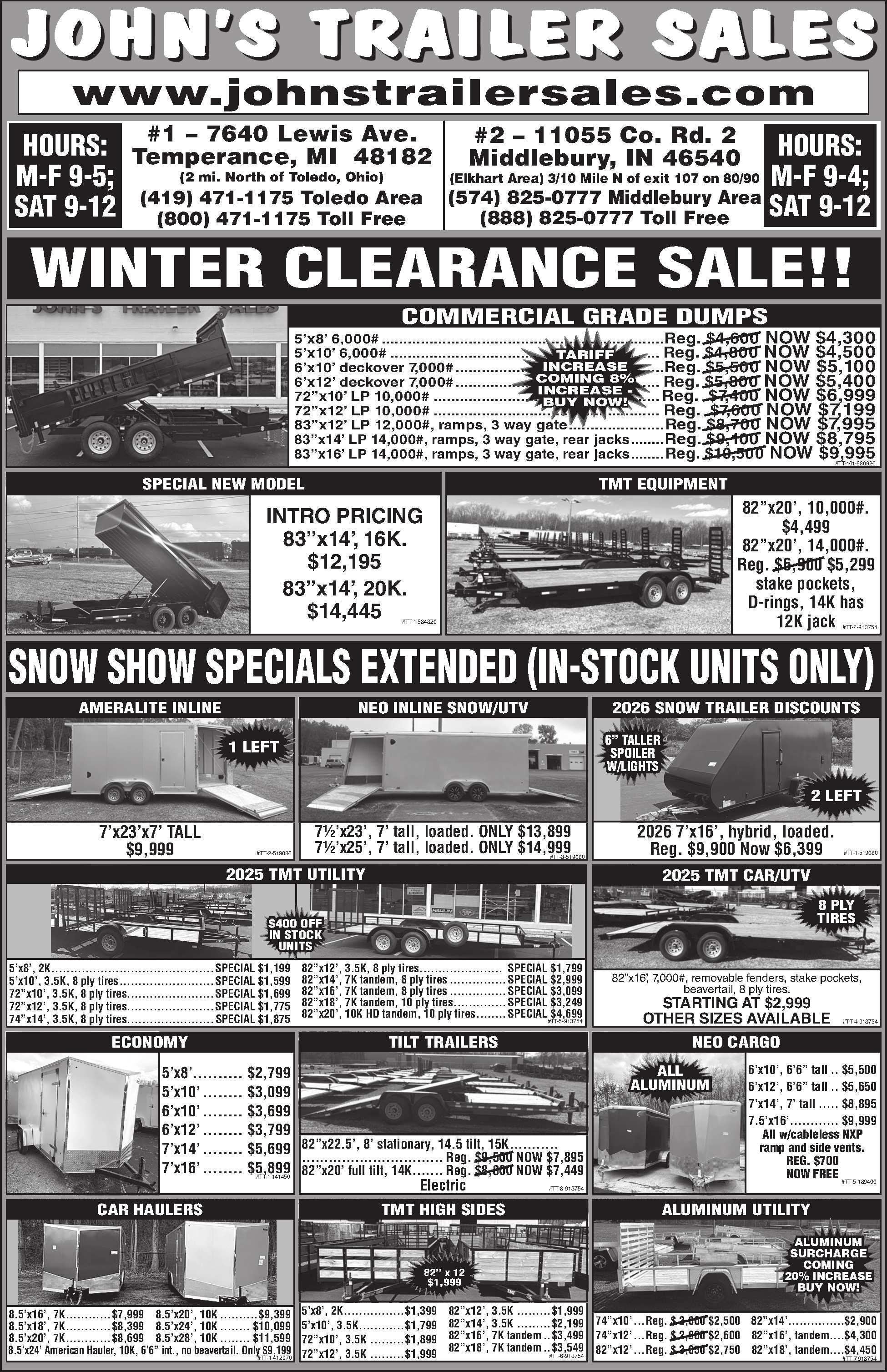 83”x14’QUALITYSTEELECONOMY DUMPTRAILER. 14,000#,only5left available.$7,700.Whilesupplieslast. John’sTrailerSales.2Locations. Temperance,MIandMiddlebury,IN. 419-471-1175or JOHNSTRAILERSALES.COM