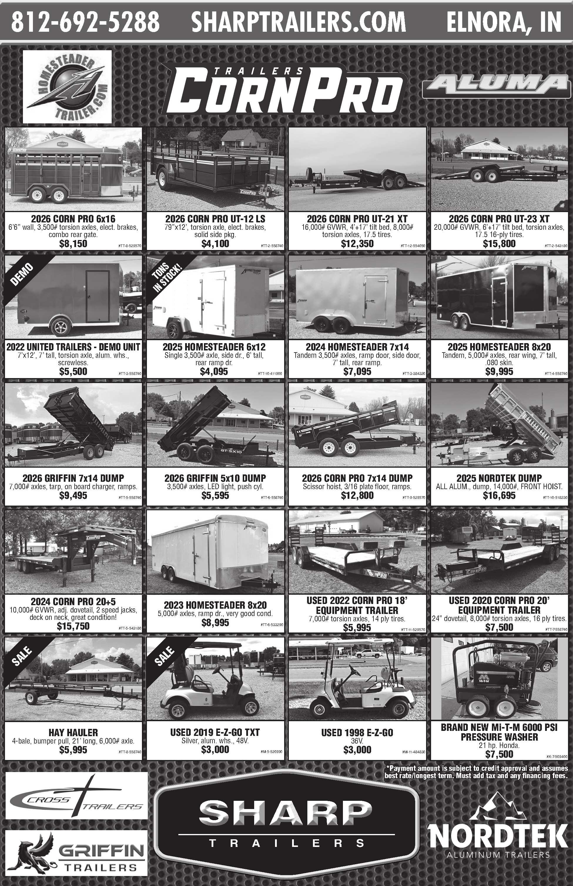 2026HOMESTEADER7x16. Tandem axle,OHVpkg.,rampdoor,rearwing w/loadlights.$7,195.Checkoutallofour trailersandgolfcartsatSharpTrailers, Elnora,IN. www.sharptrailers.com 812-692-5288