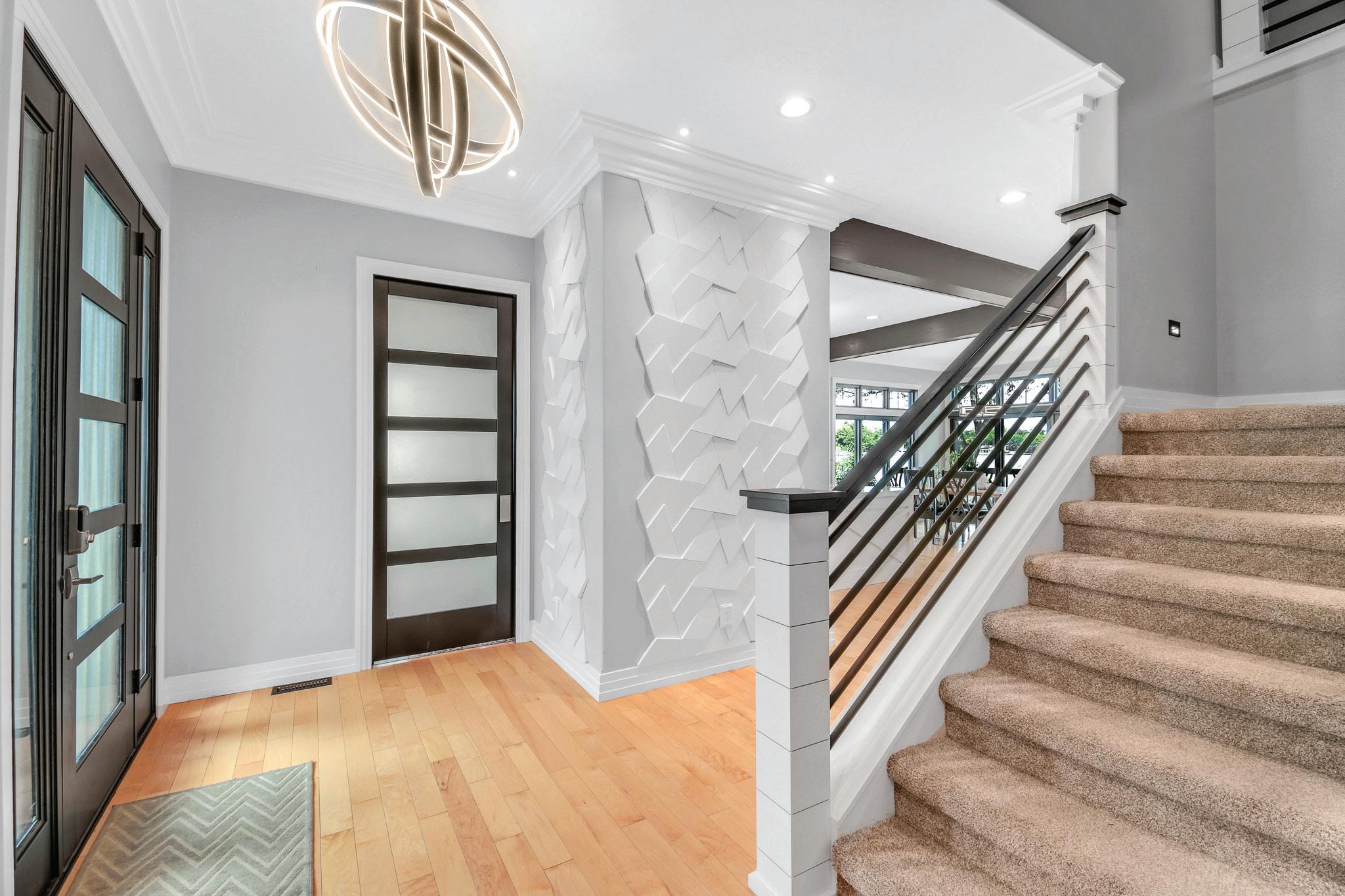 Modern details adorn the home, including this modern focal accent wall in the home’s entry.