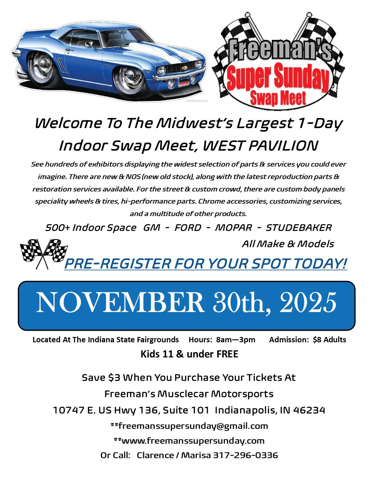 WEAREAFULLLINERESTORATION PARTSSTOREFOREARLYCAMARO, CHEVELLE&NOVAS. Sheetmetal,bumpers, moldings,carpet,interiors,rubberseals&much, muchmore.Alwayslookingtobuyprojectcarsor partscars.Stopbyourstore,open6daysaweek: M-F9a.m.-6p.m.&Sat.9a.m.-1p.m.Locatedone halfmileEastofLucasOilRacewayPark. Freeman’sMusclecarMotorsports,10747E.US Hwy.136,Suite101,Indianapolis,IN46234. email:clarencefreeman@att.net 317-328-8360 376120