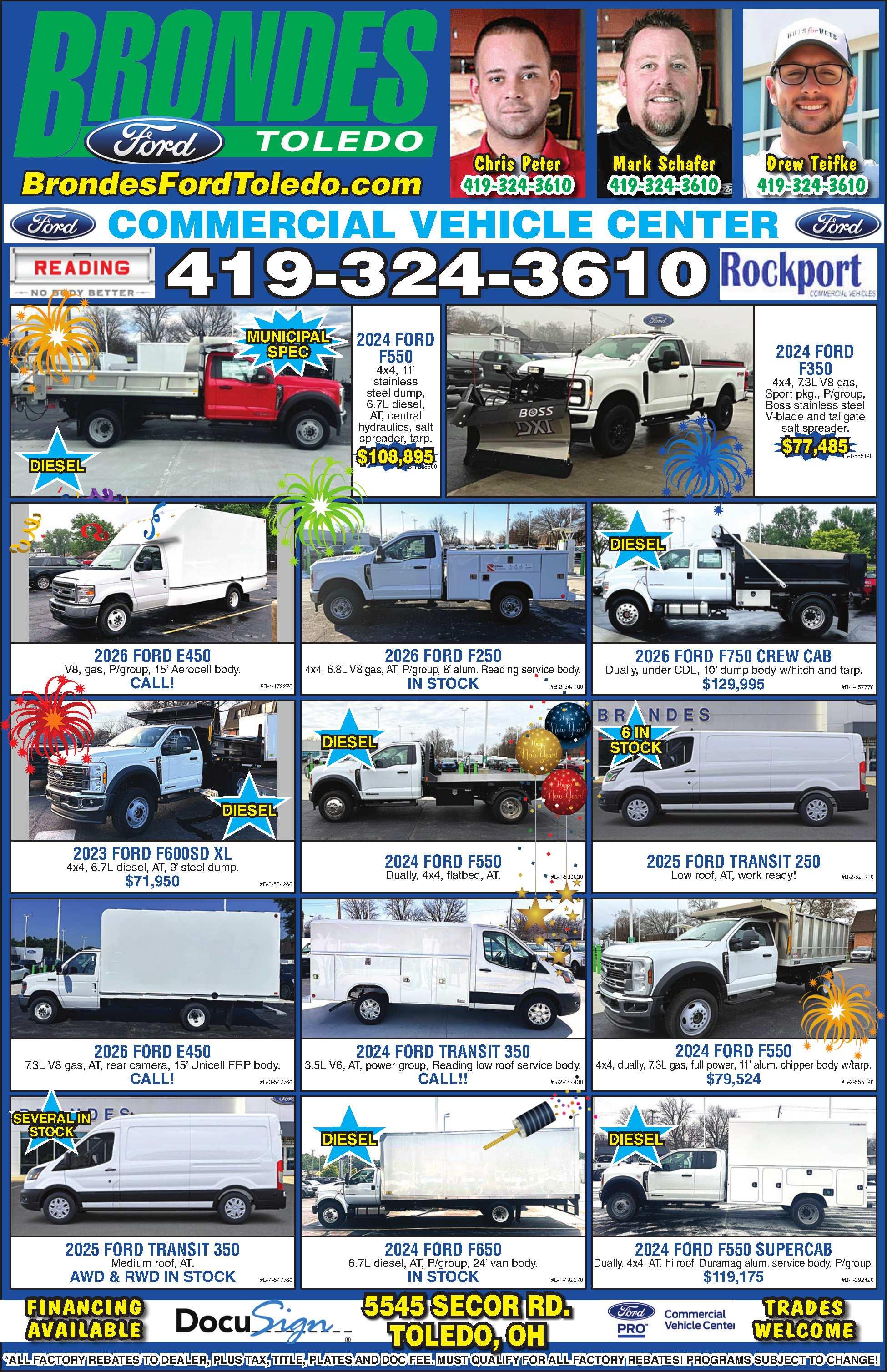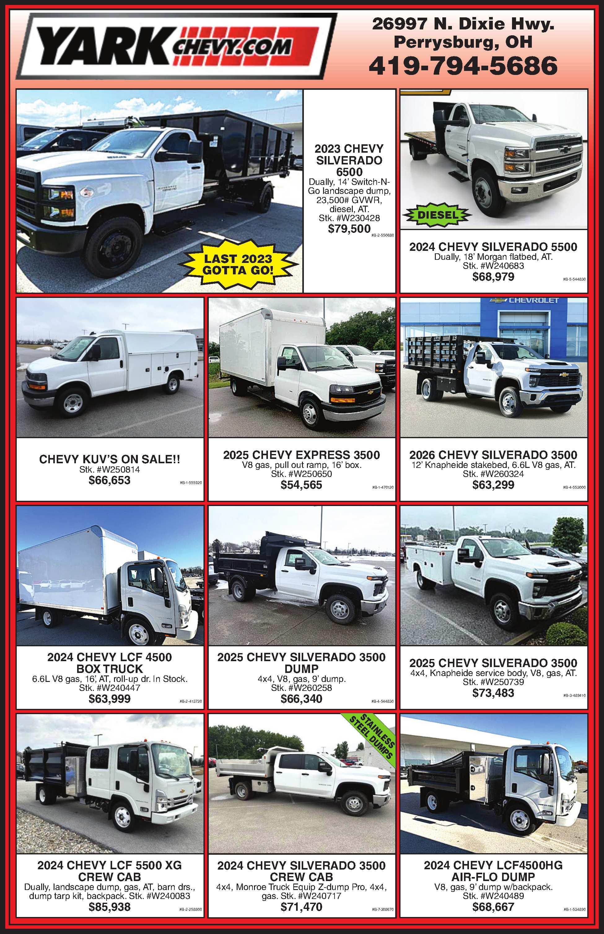 4x4, 6.6L gas V8, w/9’ Monroe service body. Stk. #3740