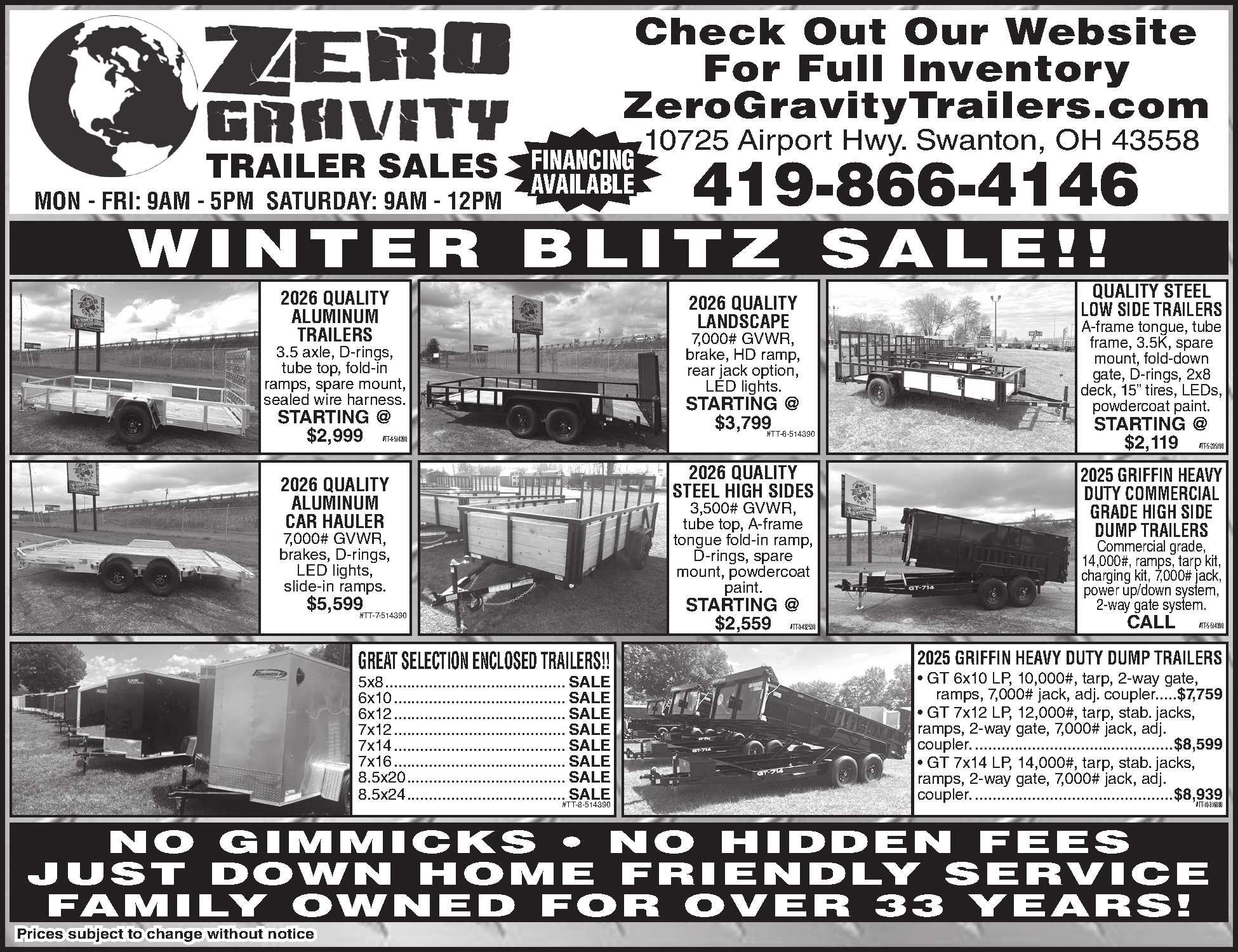 2025DISCOVERYENCLOSEDTRAILER. 24’floor,6” addt’lheight,upgrade5,200#axles.V-Nose,likenew, lessthan500mi.,charcoalcolor,steelframe.$10,000. Whitehall,MI.269-419-5988 555050