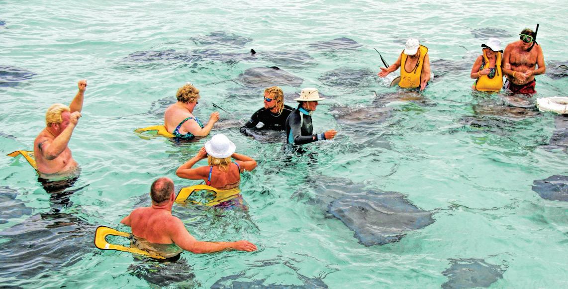 Grand Cayman, largest of the three islands (22 miles long, eight miles wide), is home to Stingray City, the name given to shallow sandbars which are home to a gathering of