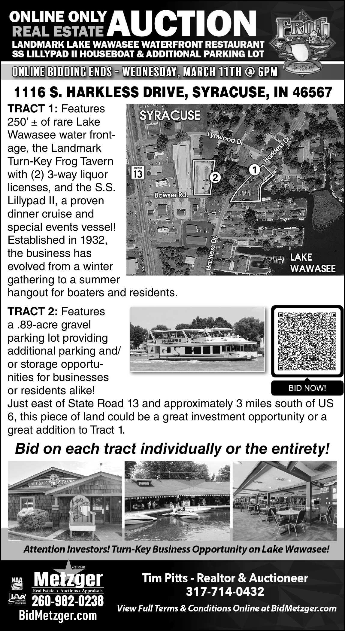 Bidding open until 6 p.m. Wednesday, March 11. Property located at 1116 S. Harkless Drive, Syracuse. Tract 1: Tavern and special events vessel, 250 ft. Lake Wawasee frontage. Tract 2: .89acre gravel lot. Metzger Property Service, metzgerauction.com. New Paris Phone Bid Real Estate Auction