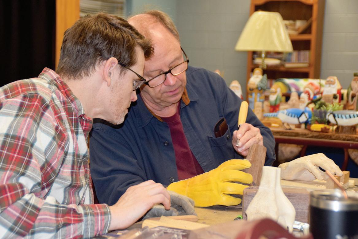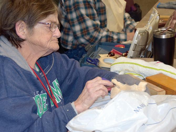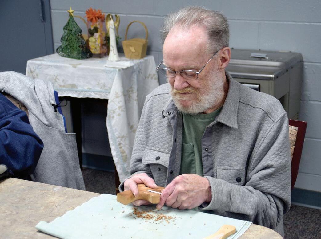 At another table Dubose gets some help from Benzel in carving in the round. Dubose was carving feet for a cabinet that will look like a dragon’s claw grasping a ball. Goering, who just started with the club a few months ago, is working on a dog figurine for a friend. Next to her, Ed Graves, was patiently carving small chips of wood out of a handheld cross he was working on. Most of the carvers wore a glove on the hand holding the piece and tape over one or two fingers as protection in case the knives they are using slip.