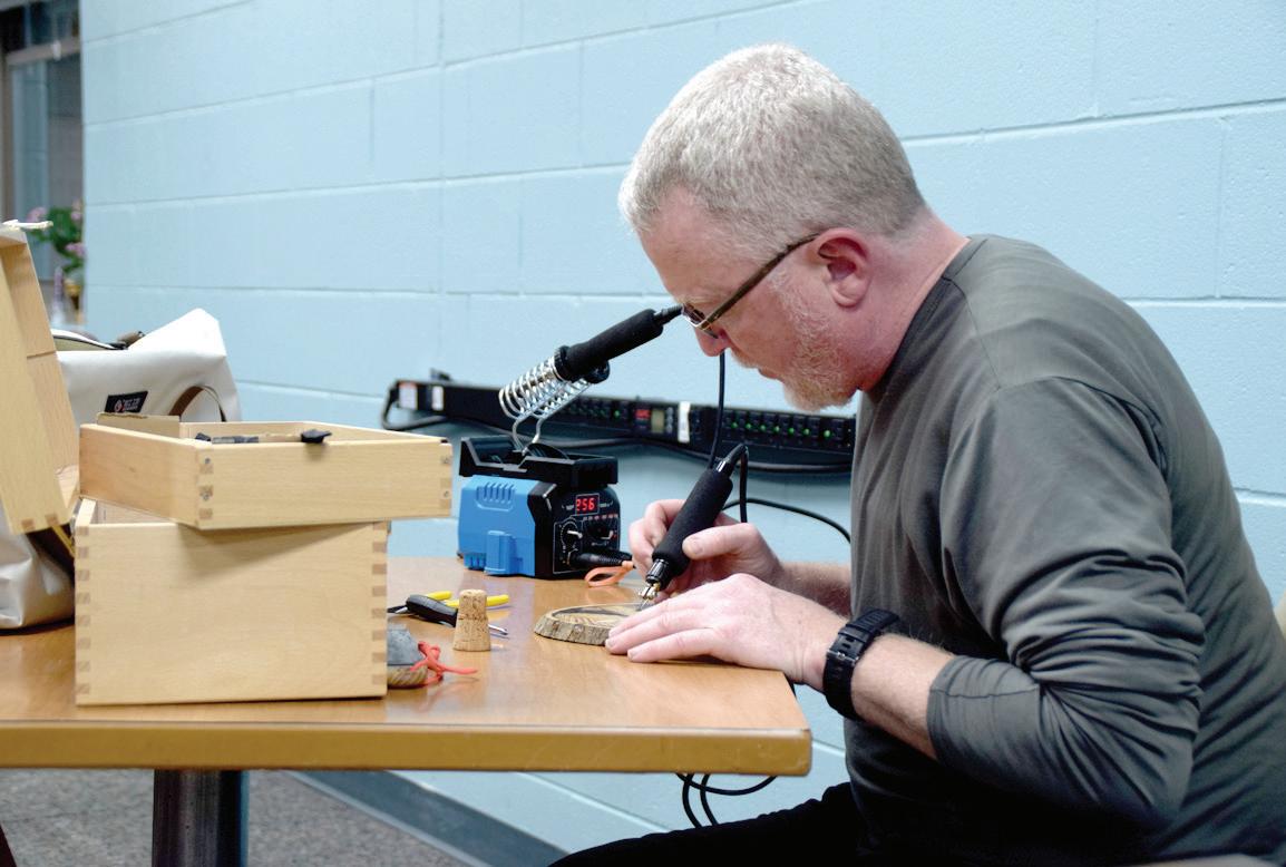 woodburning and saw what it sold for. He credits his artistic talent to his dad, Ed, but said he hasn’t carved since Cub Scouts. He explained how the amount of pressure and the angle of the soldering tool determines how thick or thin the line will be when he woodburns. Wood grain burns differently, so Eric has to spin the piece constantly to get the design he wants.