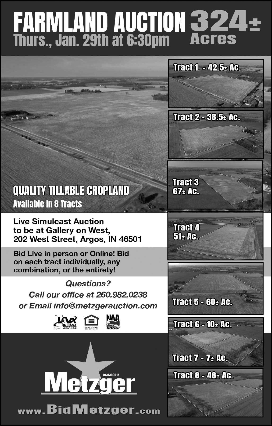 Bidding open until 7 p.m. Sunday, Jan. 25. Pickup at 1582 W. SR 114, North Manchester. Bid online at metzgerauction. com.