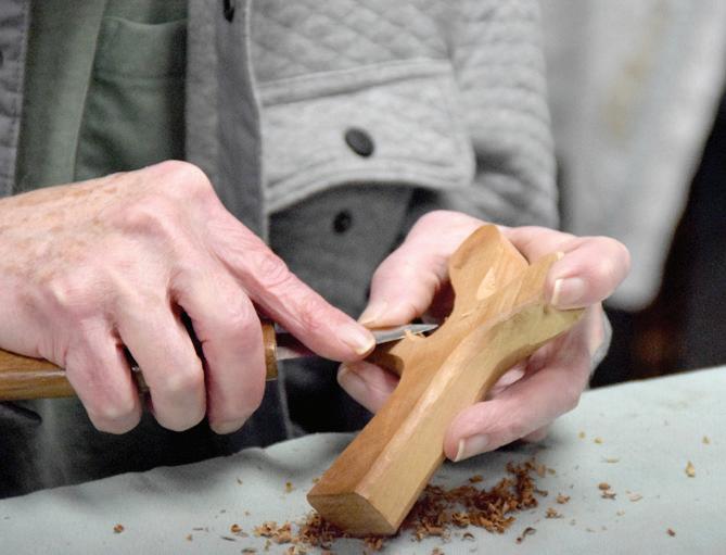— Shown is a close-up of Ed Graves hands as he carves small chips of wood away from the cross he’s working on. Graves has made several handheld crosses from a variety of woods.