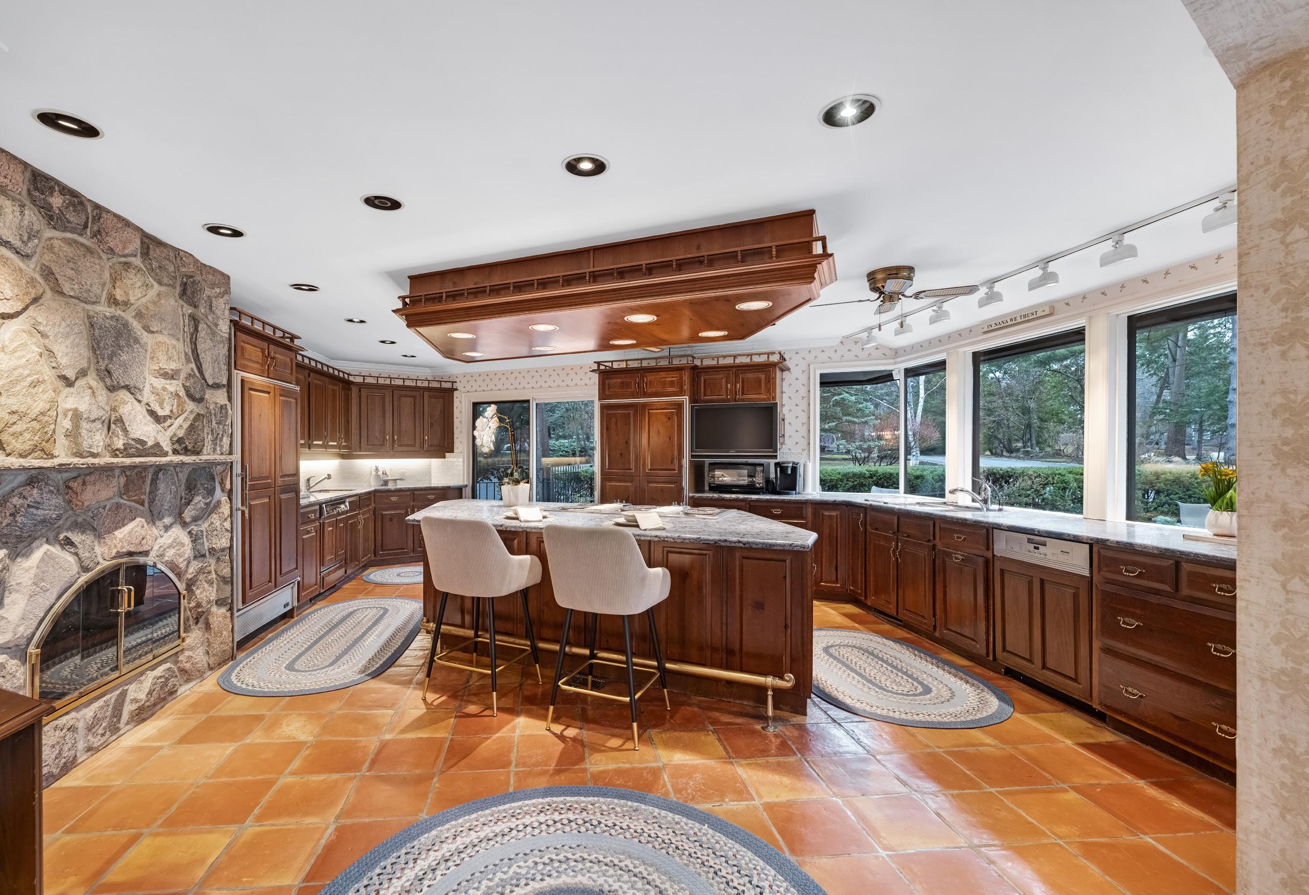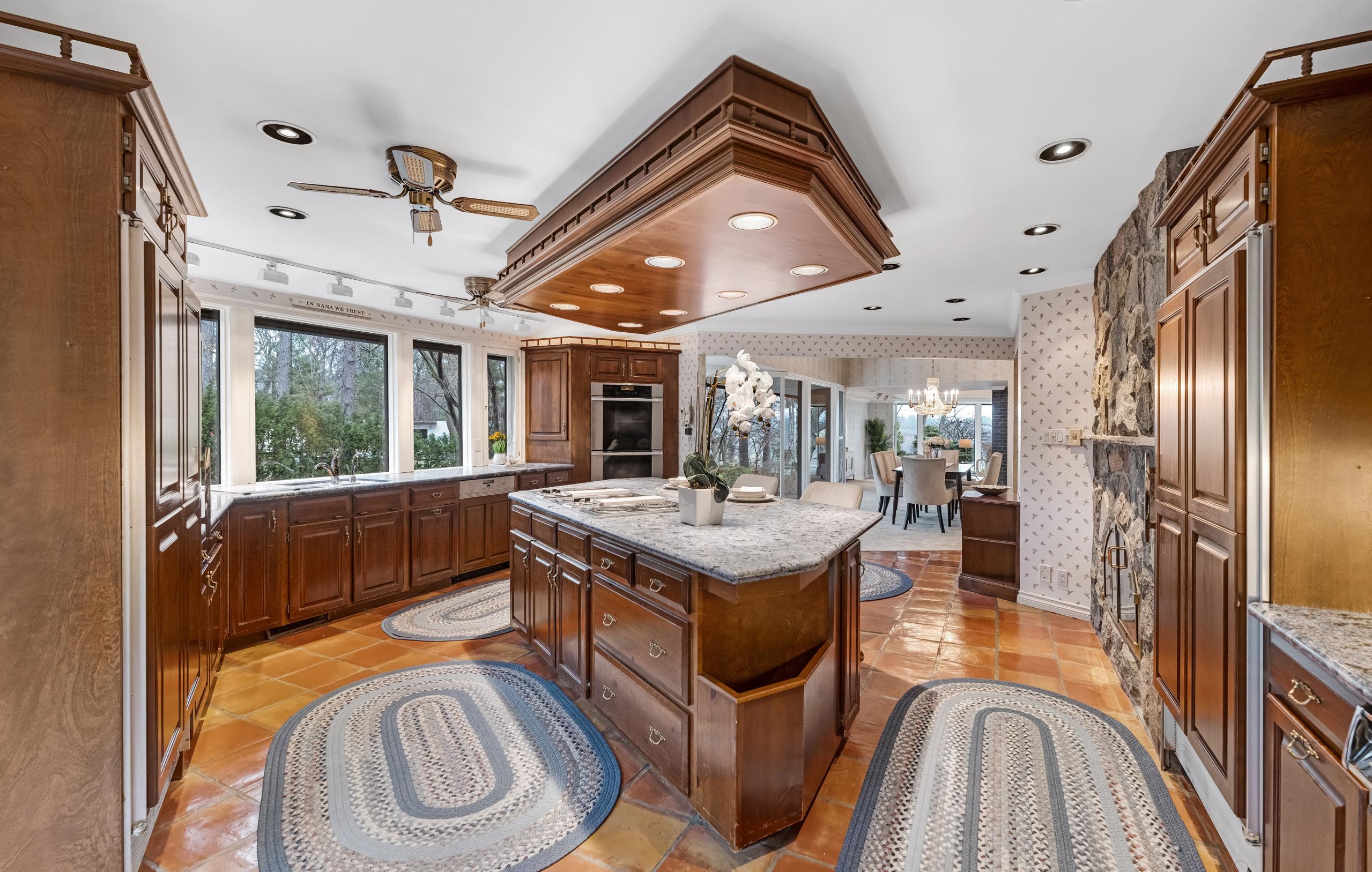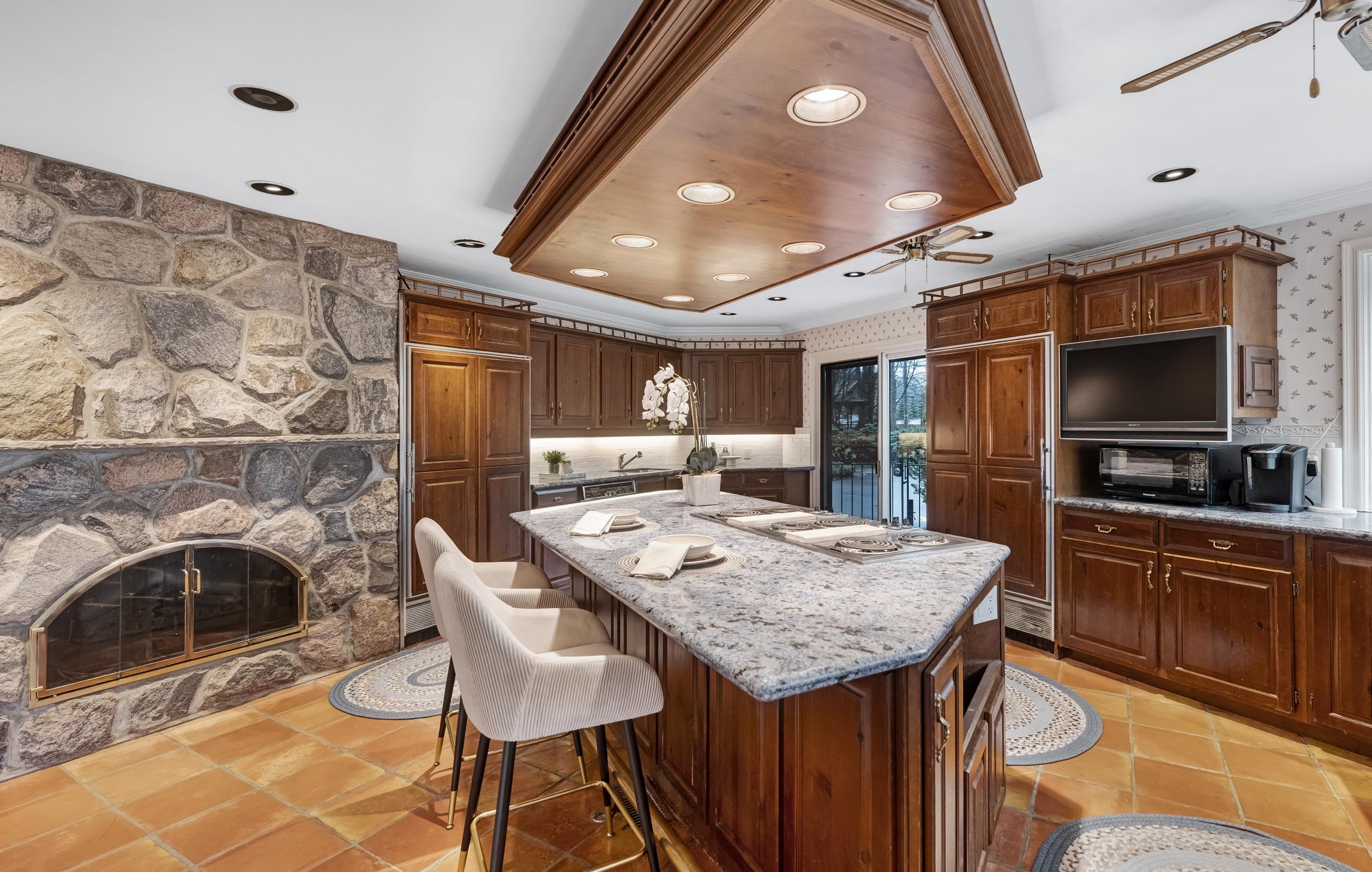 At the heart of the home, the kitchen reveals itself as a timeless culinary sanctuary, adorned with rich wood cabinetry and exquisite French-imported granite surfaces. A generous centre island anchors the space, while a striking stone-accented fireplace introduces an inviting ambiance rarely found in modern design. Sunlight pours through expansive windows, illuminating picturesque greenery and creating a seamless transition to the outdoor terraces.