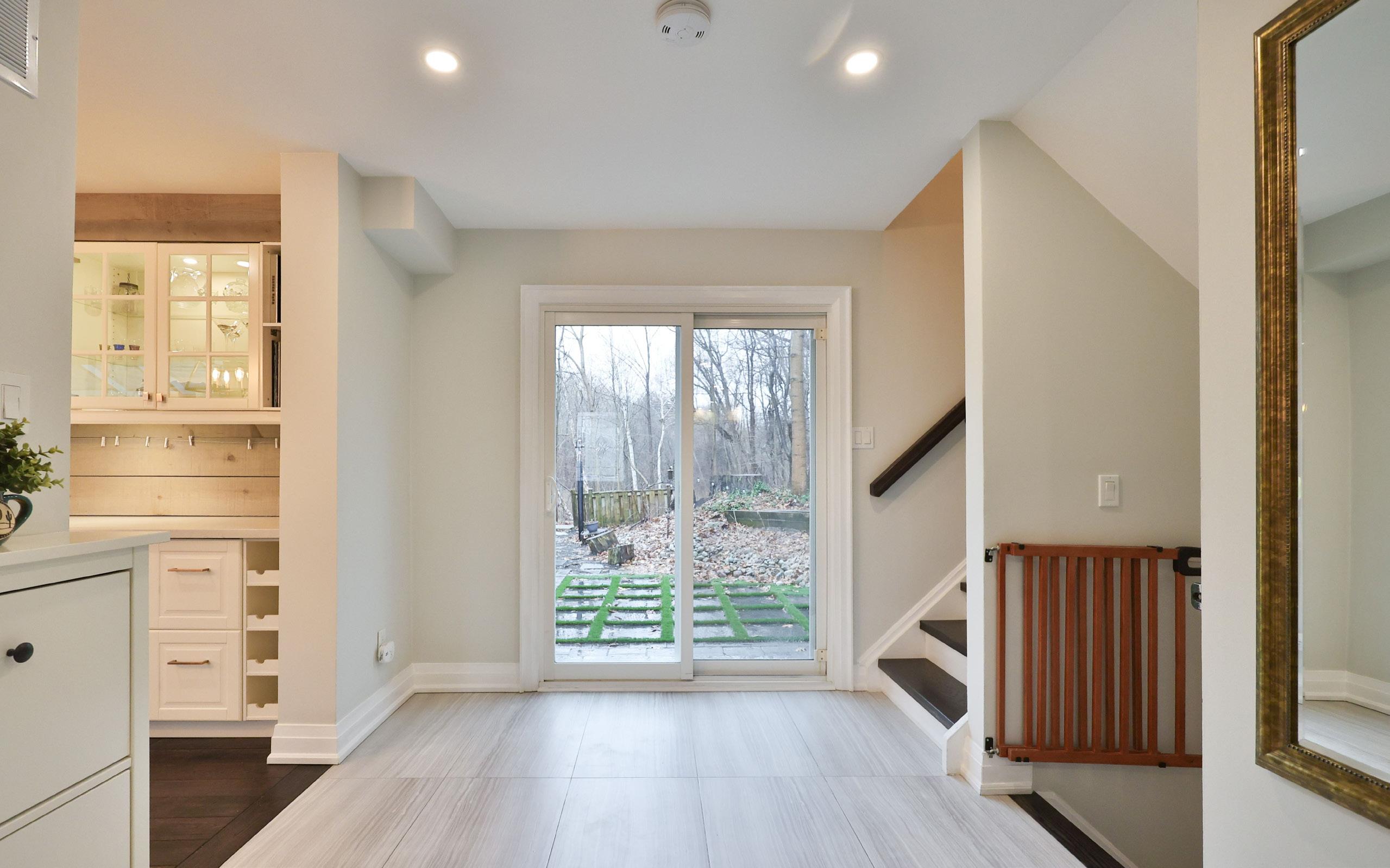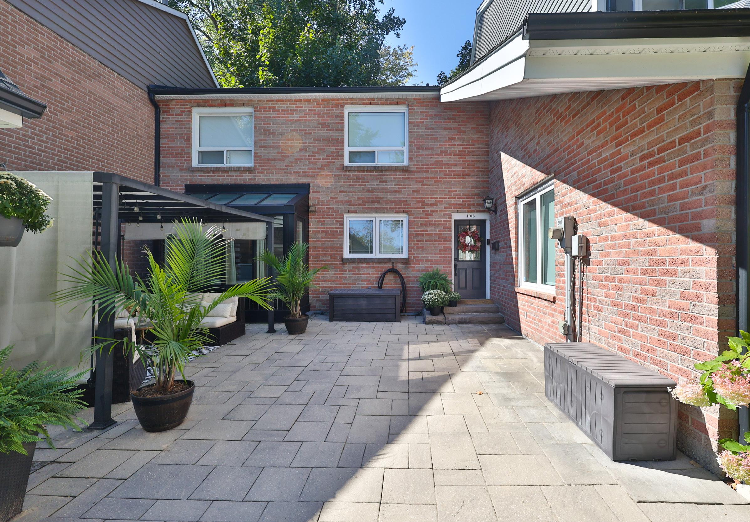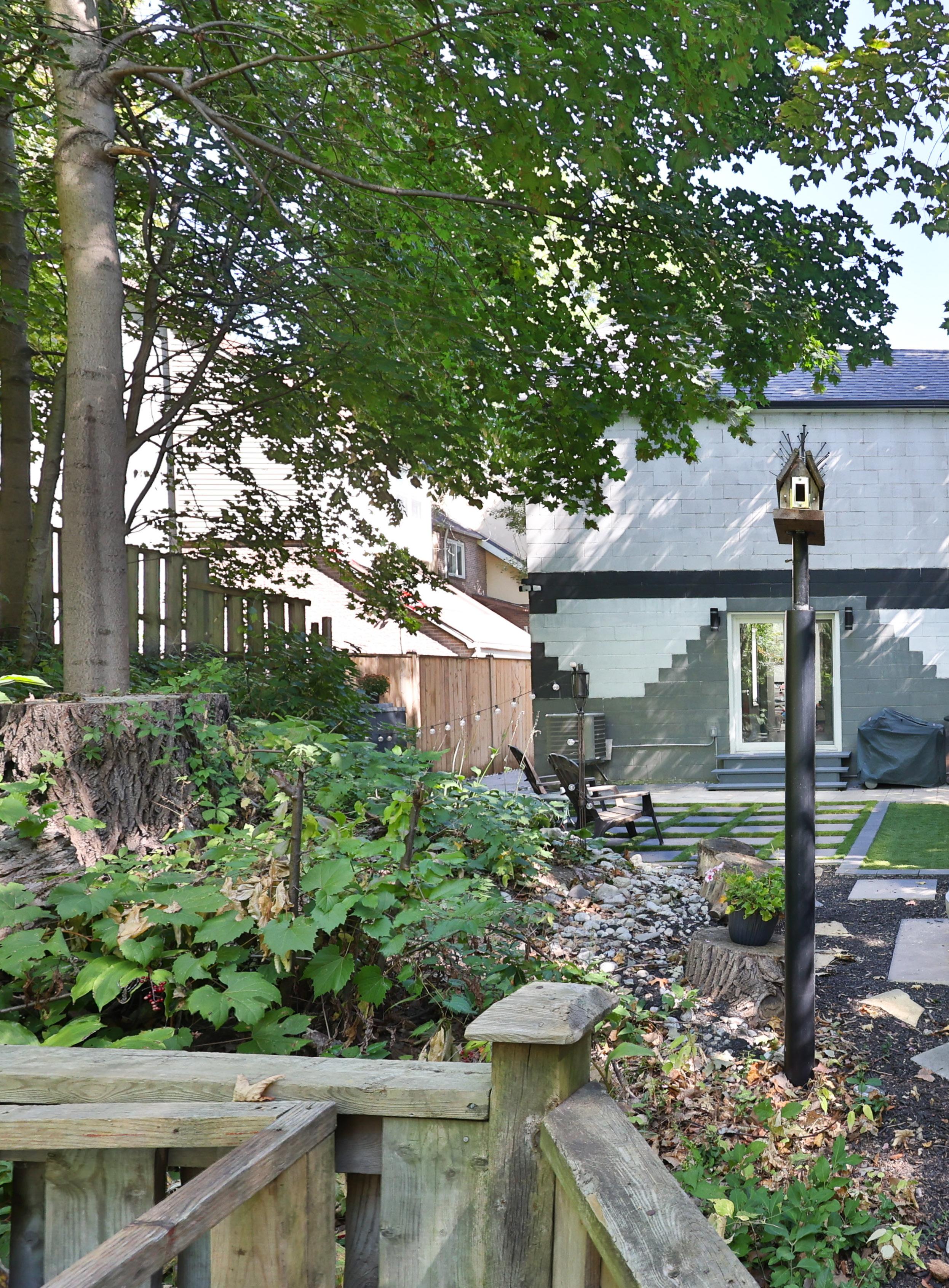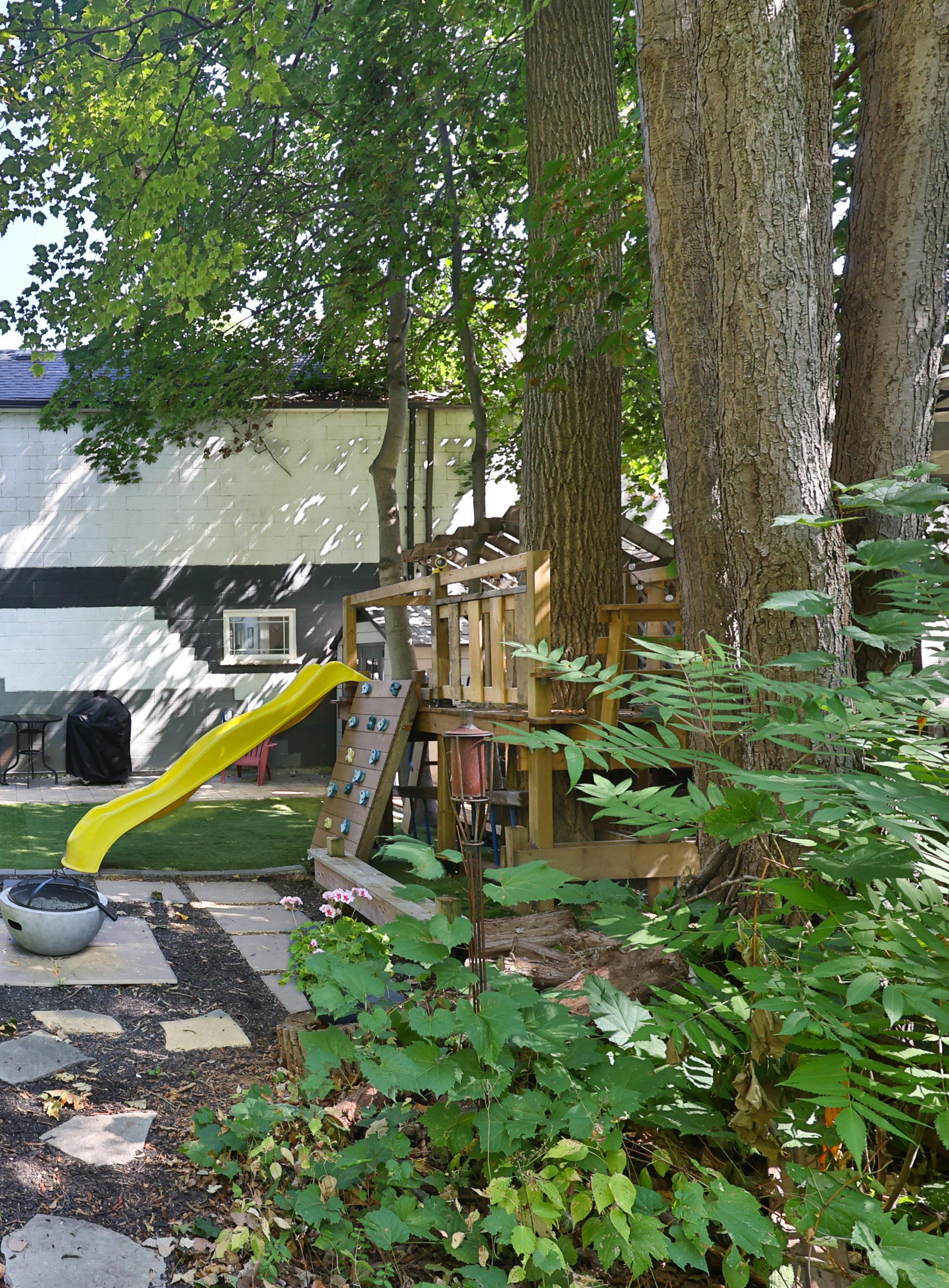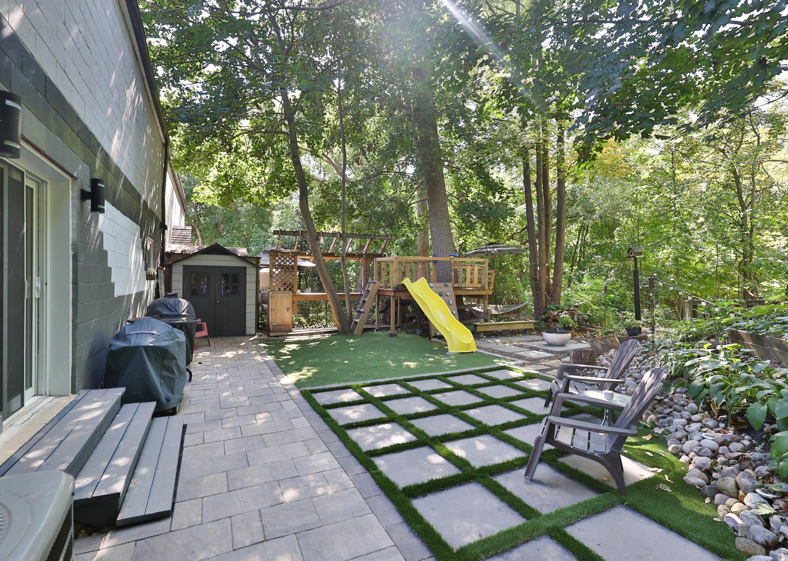 Outdoors, a private, fully hardscaped backyard creates an exceptional setting for both leisure and entertaining. Thoughtfully redesigned with a built-in bar, play structure, and lush green backdrop, this space offers rare privacy with no rear neighbours, an idyllic extension of the home’s living environment. The front landscaping and detached garage further enhance the property’s curb appeal.