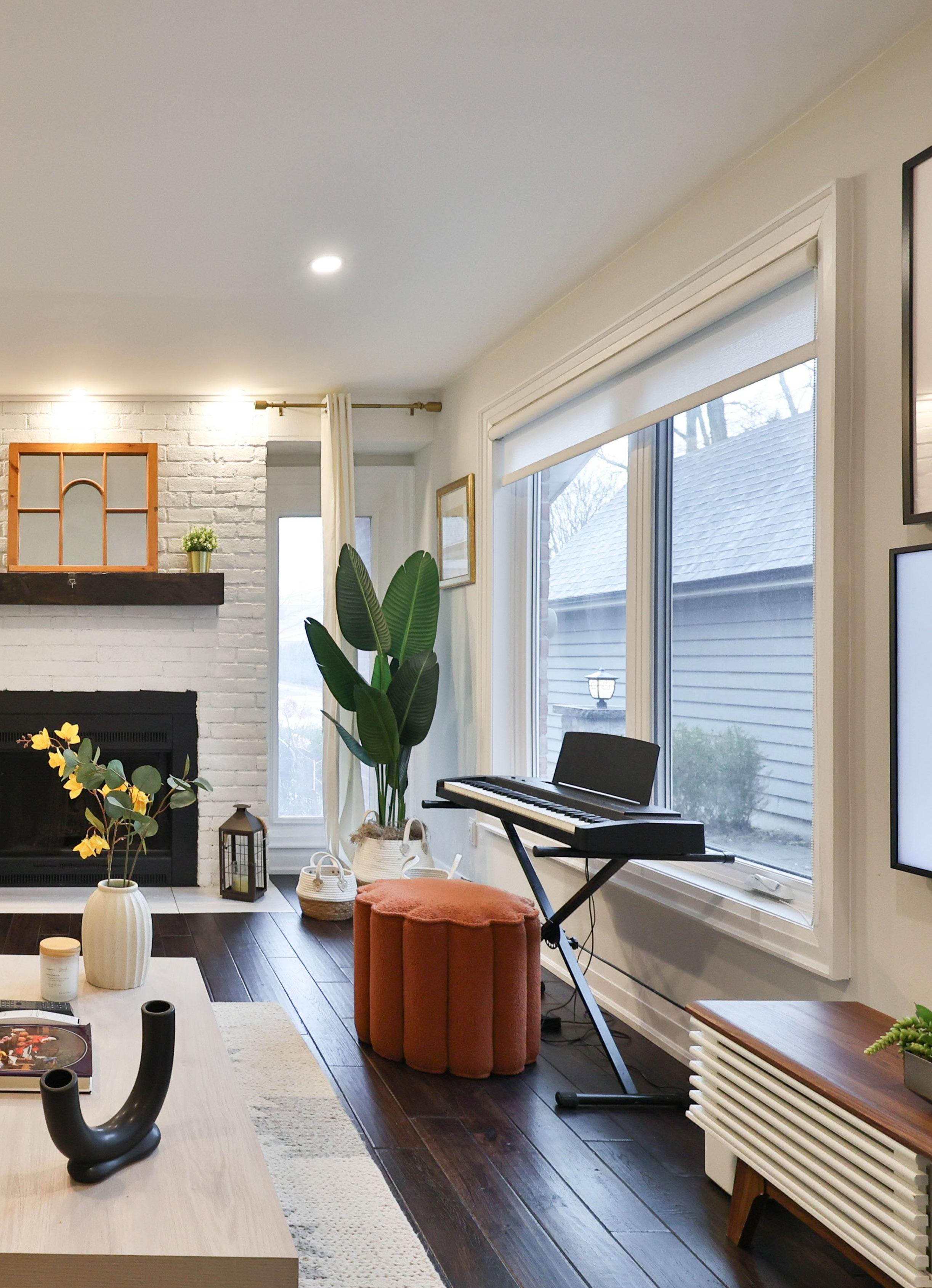 A separate living room offers a refined retreat, where a charming wood-burning fireplace and exposed brick detailing create a warm and inviting ambiance. Expansive windows bathe the space in natural light, while a stylish powder room and thoughtfully designed storage solutions enhance both practicality and ease of living.