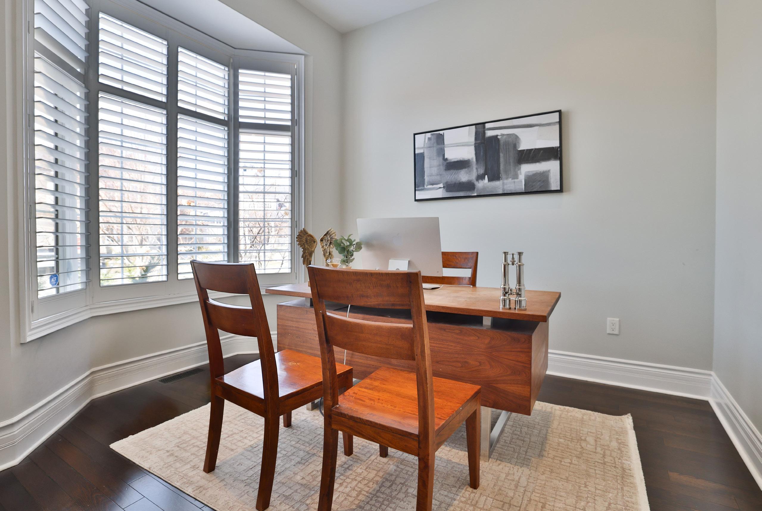 Additional bedrooms are equally refined, each thoughtfully designed to balance elegance with comfort. Intricate crown moulding, classic wainscotting, and custom millwork details enhance their character, while well-appointed bathrooms, including a semi-ensuite and a Jack and Jill, provide both convenience and privacy for growing families. A charming upper-level workstation overlooking the foyer introduces a versatile space for study, creativity, or quiet reflection.