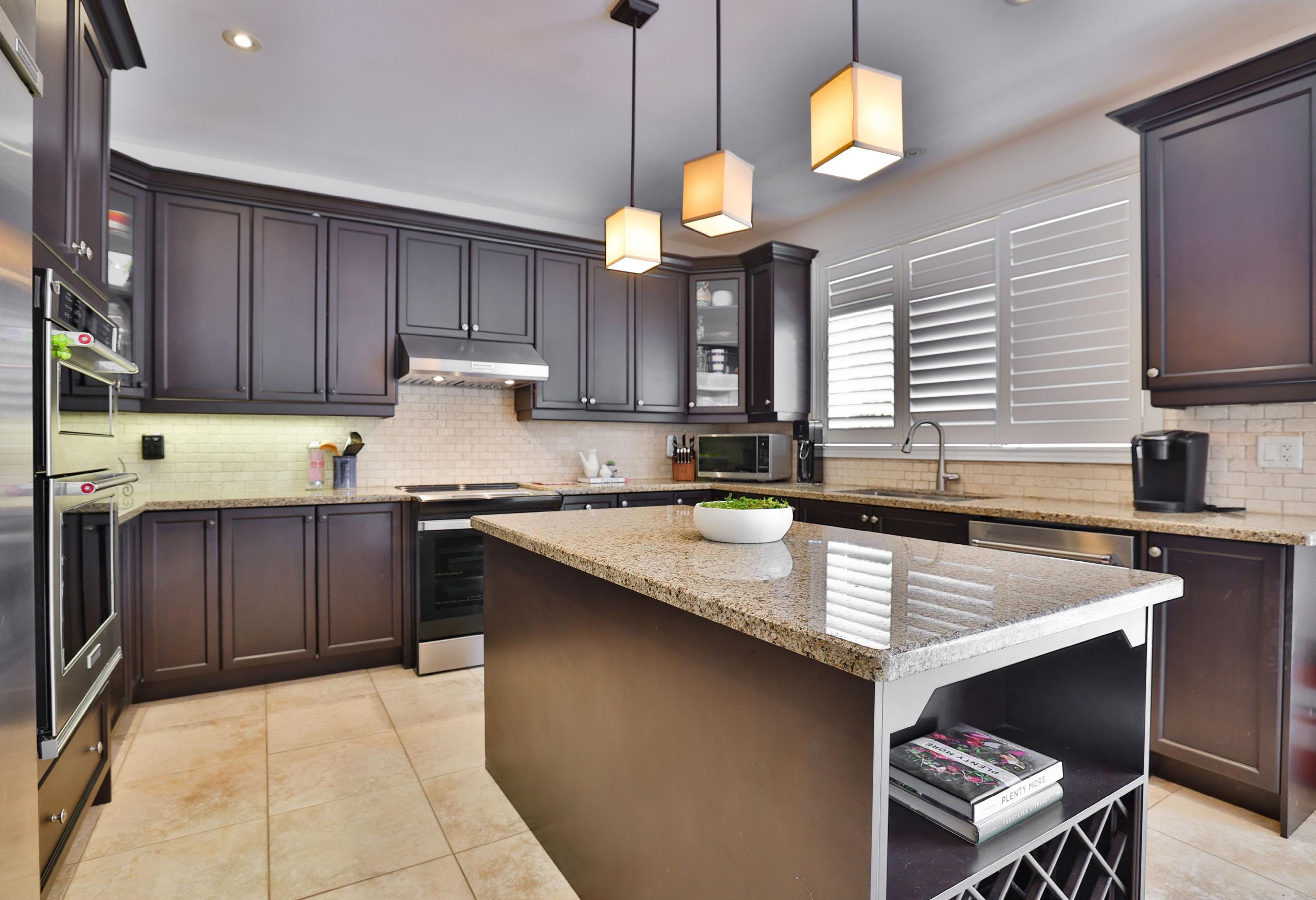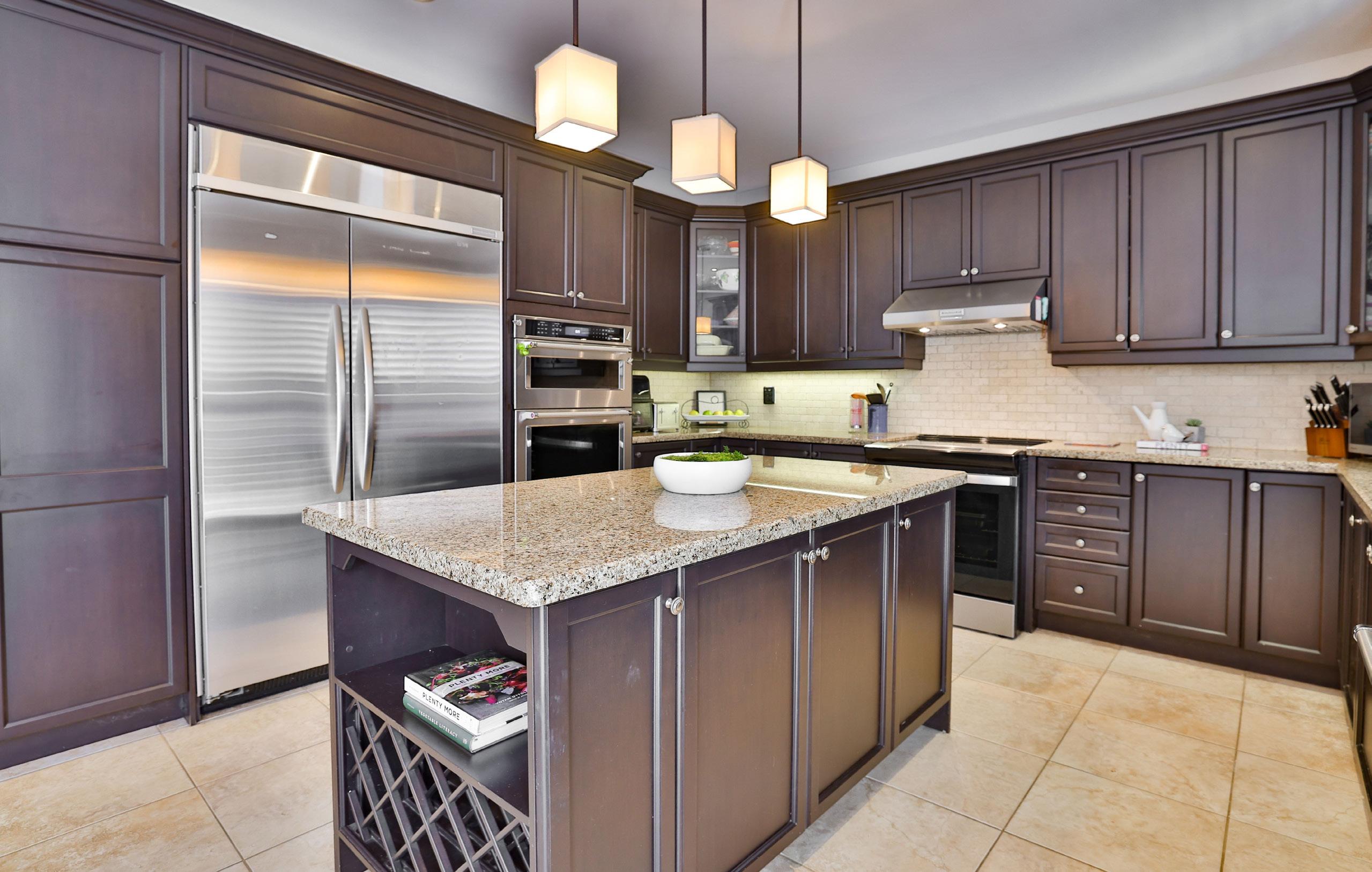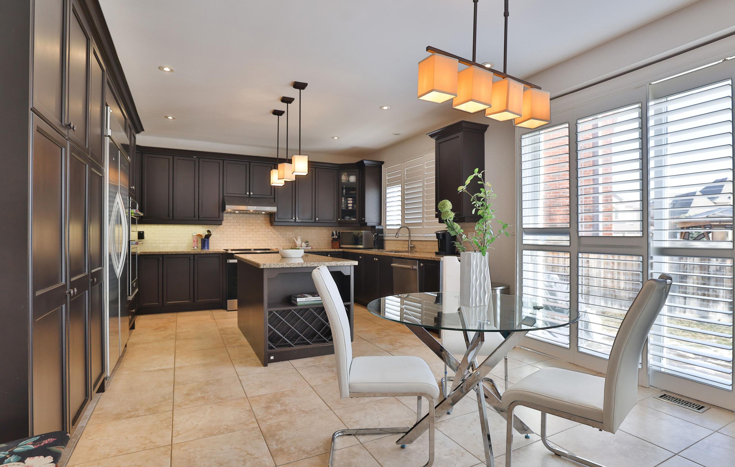 At the heart of the home, a beautifully appointed kitchen offers both visual impact and everyday practicality. Rich cabinetry, granite countertops, and premium stainless steel built-in appliances are complemented by a generous centre island designed for gathering. A sunlit breakfast area extends outward through sliding glass doors, creating a seamless transition to the outdoor living space. A private office, thoughtfully designed laundry room, and discreet powder room complete the main level with effortless functionality.