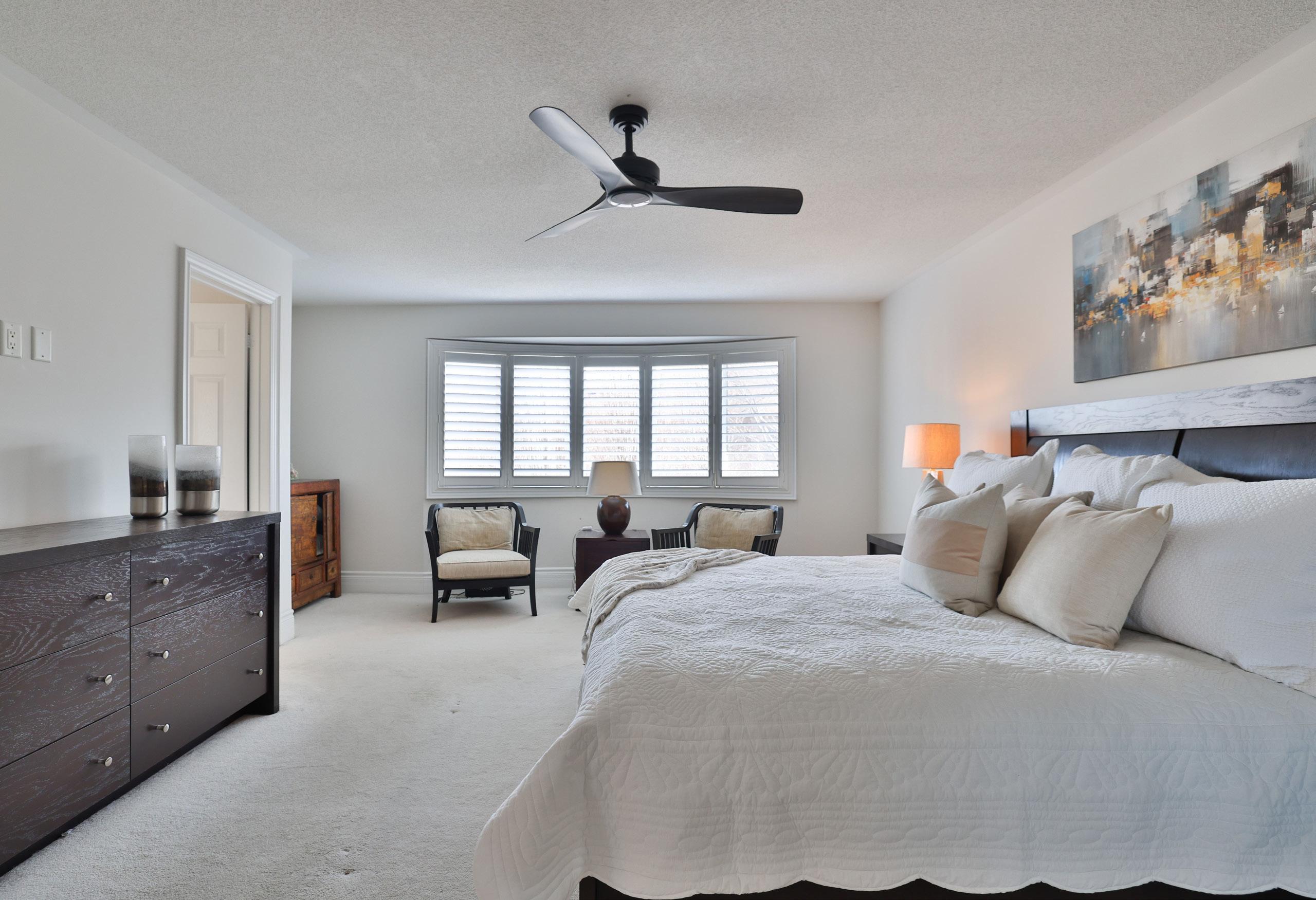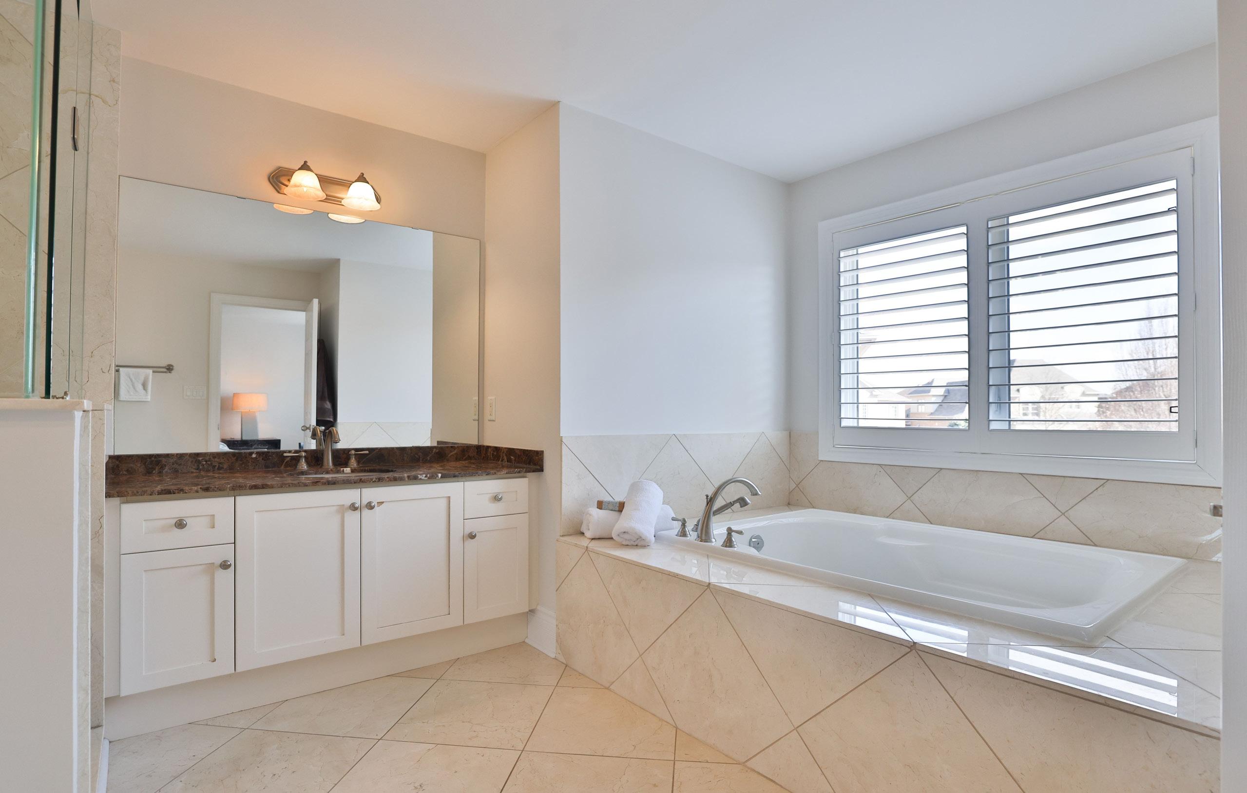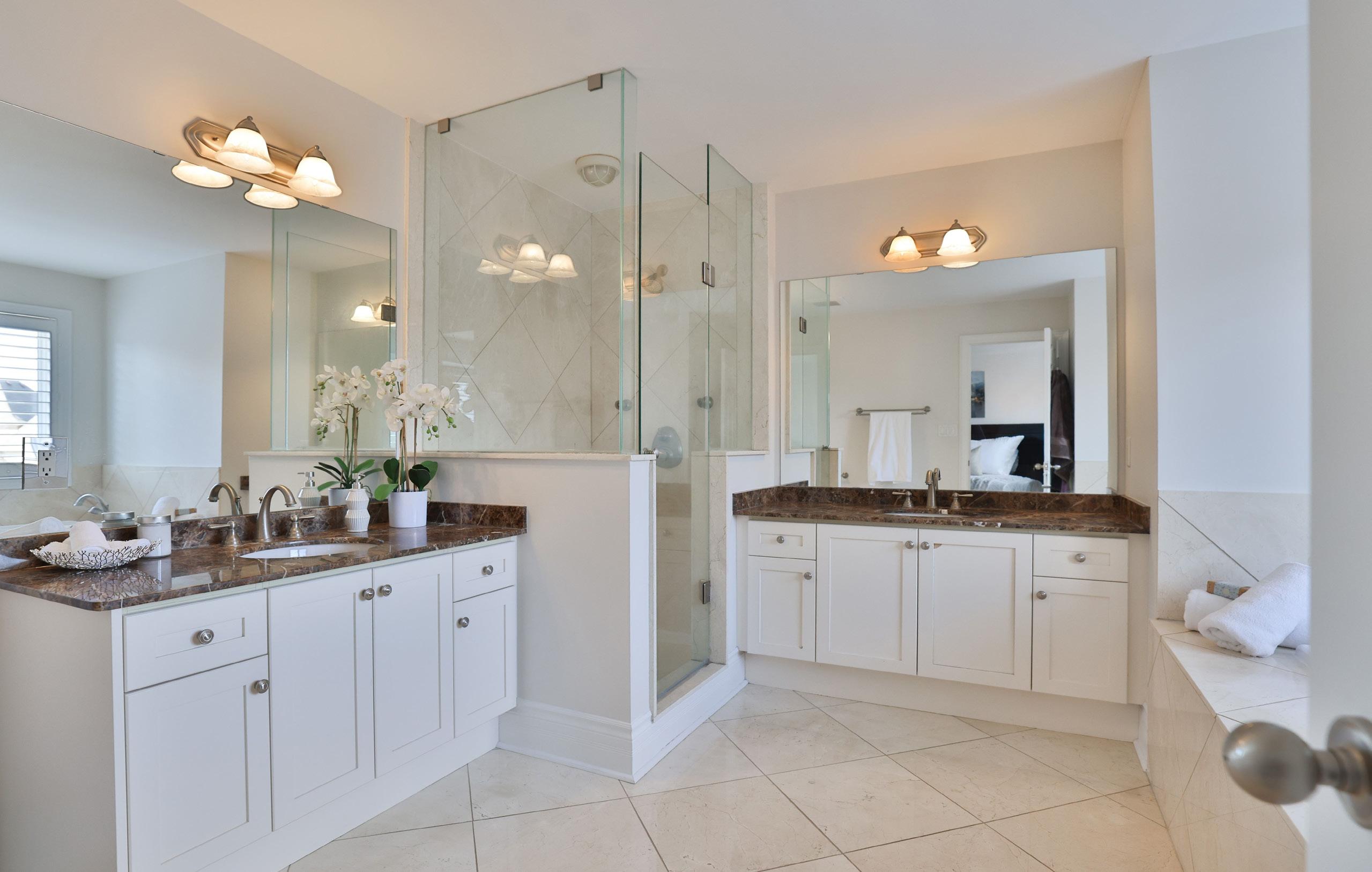 Ascending the grand winding staircase, the upper level reveals a serene primary retreat introduced through double doors. A tranquil bay window invites soft natural light, while a spacious walk-in closet with custom organizers ensures impeccable storage. The spa-inspired five-piece ensuite, finished with granite surfaces, dual vanities, a glass-enclosed shower, and a deep soaker tub, offers a luxurious sanctuary for rest and rejuvenation.