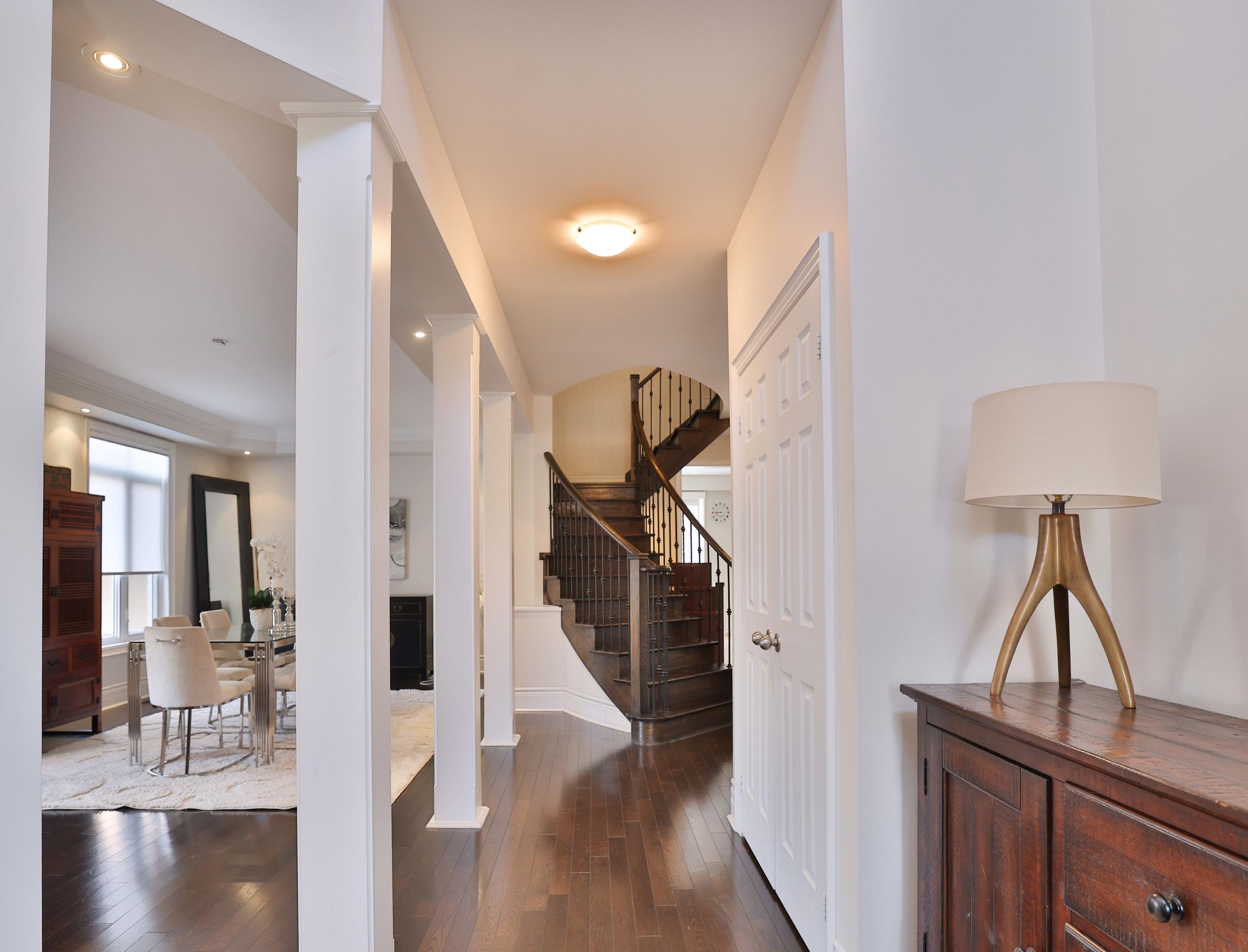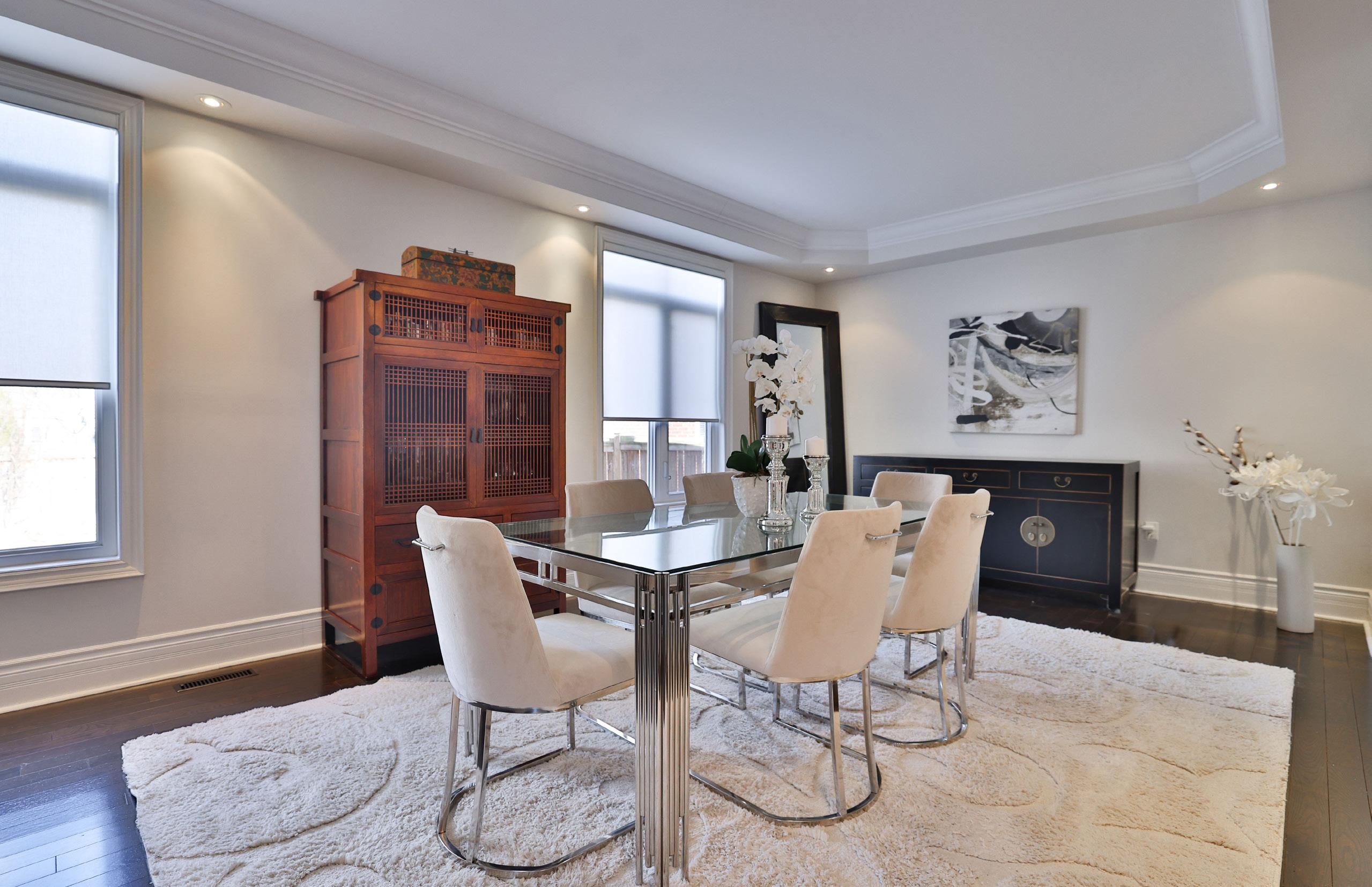 A dramatic two-storey foyer sets an unforgettable tone upon arrival, where a statement chandelier cascades light across rich hardwood flooring and elegantly detailed 7.5-inch baseboards. Soaring 9-foot ceilings enhance the sense of openness, while California shutters introduce both privacy and timeless sophistication. An inviting formal dining room, adorned with crown moulding and a recessed ceiling framed by ambient pot lighting, creates a distinguished setting for memorable family gatherings.