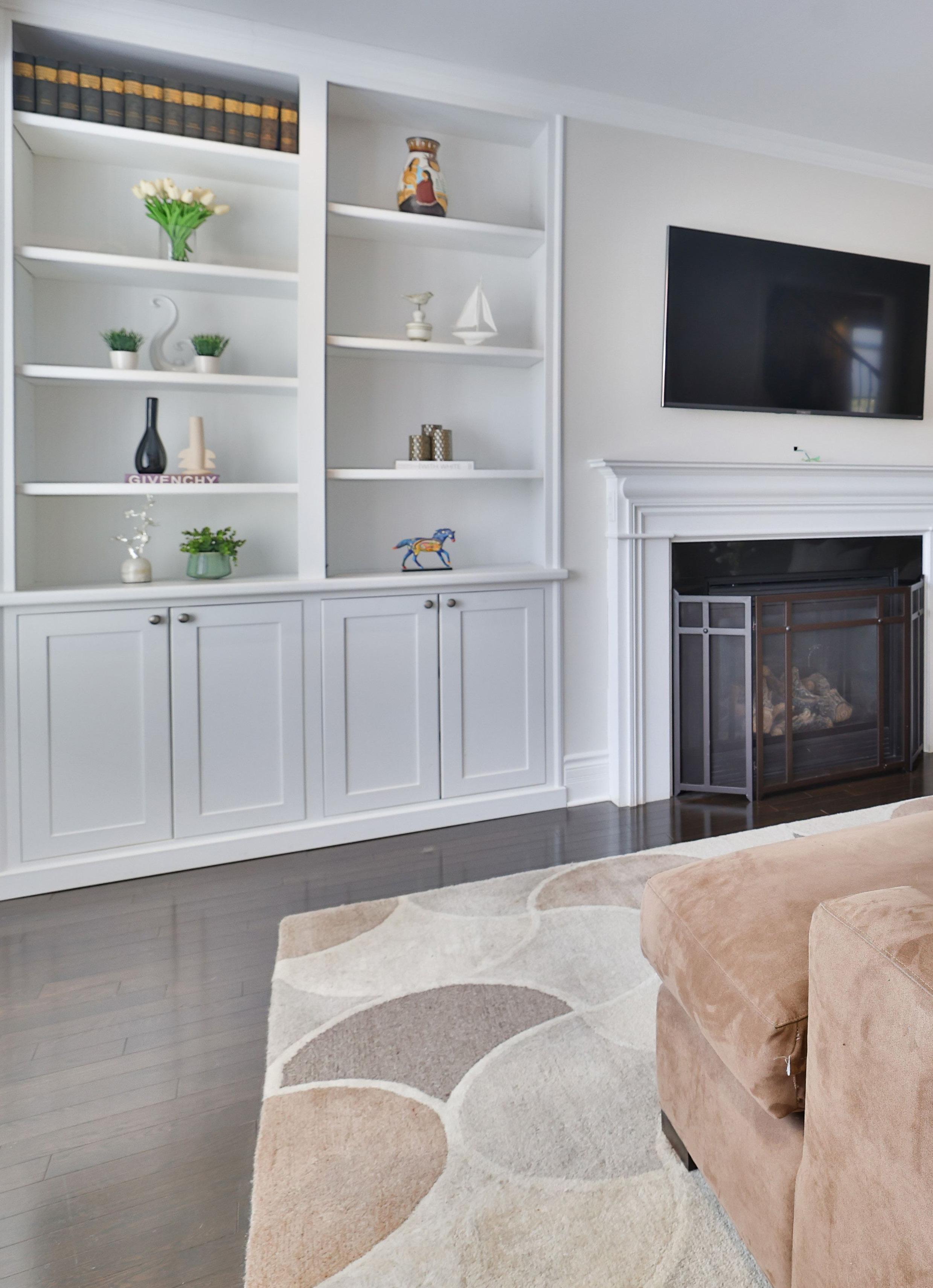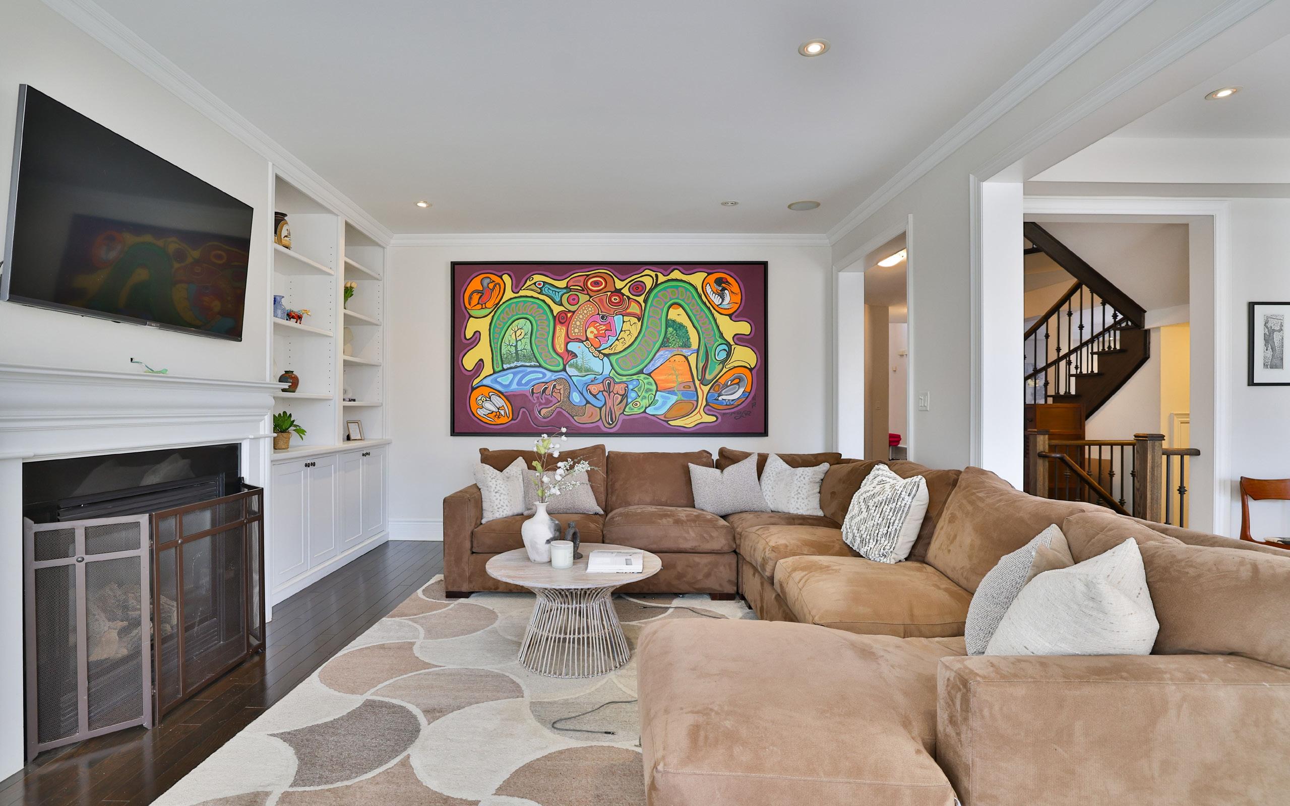 Flowing beyond, the principal living area unfolds in an open-concept design that effortlessly unites form and function. Custom built-in cabinetry frames a warm natural gas fireplace, while expansive windows and a charming bay detail flood the space with natural light. Integrated ceiling speakers and refined finishes elevate the atmosphere, crafting a setting equally suited for relaxed evenings or elegant entertaining.